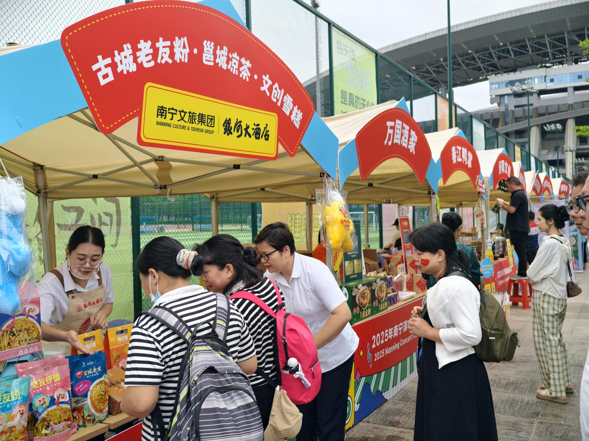 為豐富演唱會外延體驗(yàn),南寧文旅集團(tuán)精心策劃一系列配套活動。在廣西體育中心噴泉廣場,打造47個(gè)攤點(diǎn)的廣西非遺特色演唱會市集。南寧文旅集團(tuán)聯(lián)合貓千歲品牌出品的“邕有禮”銀耳系列好禮成為市集的焦點(diǎn);銀河公司旗下的古城老友粉、邕城涼茶以及文創(chuàng)雪糕讓歌迷們大飽口福,“邕城涼茶”更是連續(xù)兩天在開場前被搶購一空;五象山莊在體育館內(nèi)區(qū)域設(shè)立“五象能量站”,提供薄荷檸檬水、凍檸樂、手作軟歐包等,供粉絲進(jìn)行現(xiàn)場的能量補(bǔ)給。據(jù)統(tǒng)計(jì),為期兩天的演出,共吸引3萬歌迷體驗(yàn)市集活動。
