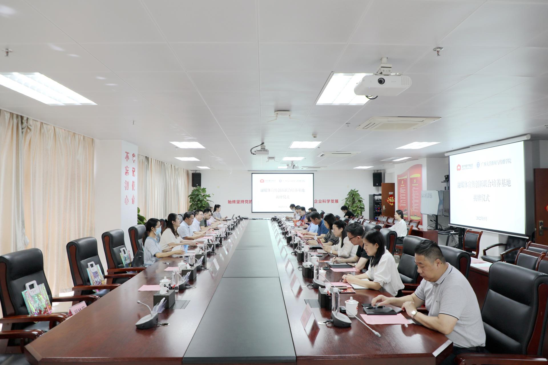 5月30日,南寧威寧集團(tuán)、廣西大學(xué)新聞與傳播學(xué)院共建融媒體宣傳創(chuàng)新聯(lián)合培養(yǎng)基地揭牌儀式暨座談會(huì)在威寧大廈22樓第一會(huì)議室舉行,廣西大學(xué)新聞與傳播學(xué)院黨委書記唐興一行8人,集團(tuán)黨委副書記馬超毅,集團(tuán)公司黨委宣傳部、人力資源部負(fù)責(zé)人,各監(jiān)管單位宣傳工作分管領(lǐng)導(dǎo)參加活動(dòng)。