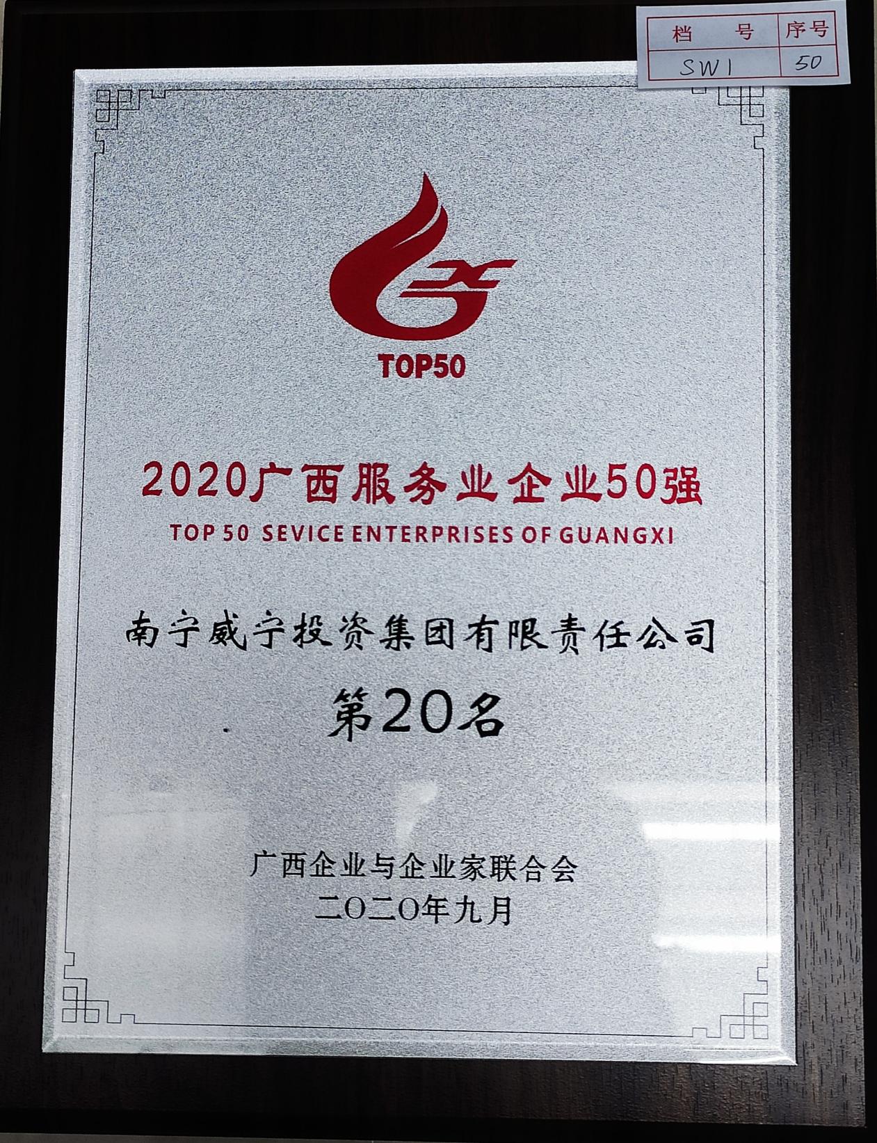 2020年9月,南寧威寧集團榮獲南寧市南寧市企業(yè)和企業(yè)家聯(lián)合會授予的2020年度廣西服務(wù)業(yè)企業(yè)50強第20名