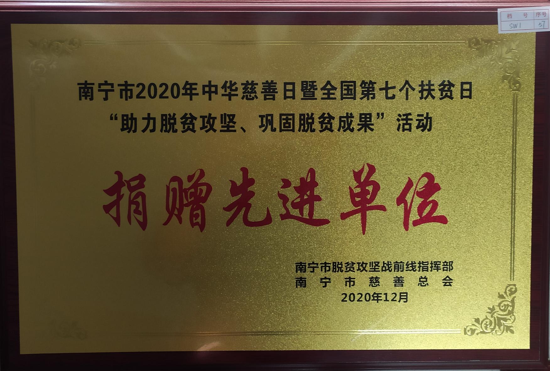 2020年12月,南寧威寧集團榮獲南寧市脫貧攻堅戰(zhàn)前線指揮部、南寧市慈善總會授予的南寧市2020年中華慈善日暨全國第七個扶貧日“助力脫貧攻堅、鞏固脫貧成果”活動