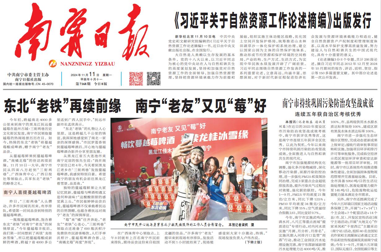 2024年年初,跨越南北3650公里來到南寧的東北蔓越莓在邕州古城·三街兩巷發(fā)放,南寧市民領(lǐng)取蔓越莓的熱鬧場景依舊歷歷在目。如今蔓越莓再豐收,熱情的東北“老鐵”將蔓越莓“變身”釀成啤酒贈予南寧“老友”品嘗。11月10日,南寧威寧集團(tuán)下屬南寧文化旅游集團(tuán)有限責(zé)任公司(以下簡稱南寧文旅集團(tuán))的兩大標(biāo)志性項(xiàng)目——邕州古城·三街兩巷與廣西體育中心,成為了蔓越莓啤酒的發(fā)放站點(diǎn),而銀河大酒店、鄉(xiāng)村大世界、五象山莊、邕城印記民俗中心等南寧文旅集團(tuán)旗下餐飲品牌也將蔓越莓啤酒與各種美食相結(jié)合,為市民們安排了一系列贈飲品嘗活動。