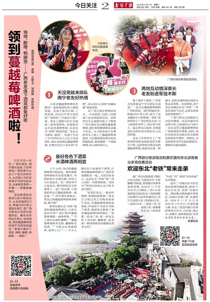 本次活動黑龍江安排了具有特色風(fēng)味的蔓越莓啤酒在南寧文旅集團(tuán)旗下文旅項(xiàng)目發(fā)放,南寧文旅集團(tuán)通過迅速整合集團(tuán)內(nèi)資源,結(jié)合各項(xiàng)目公司自身優(yōu)勢開展定制活動,以蔓越莓啤酒發(fā)放活動再造“南北CP”文旅新熱點(diǎn)。11月10日當(dāng)天,邕州古城·三街兩巷與廣西體育中心的活動現(xiàn)場人頭攢動,市民們熱情高漲,有序排隊(duì),只為親手接過這份來自遠(yuǎn)方的醇香禮物。這場跨越千里的文化盛宴,在廣西南寧絢爛上演,不僅為南寧市民的味蕾帶來了驚喜,更開啟了佳木斯與南寧兩地文化旅游深度交流合作的第二篇章。