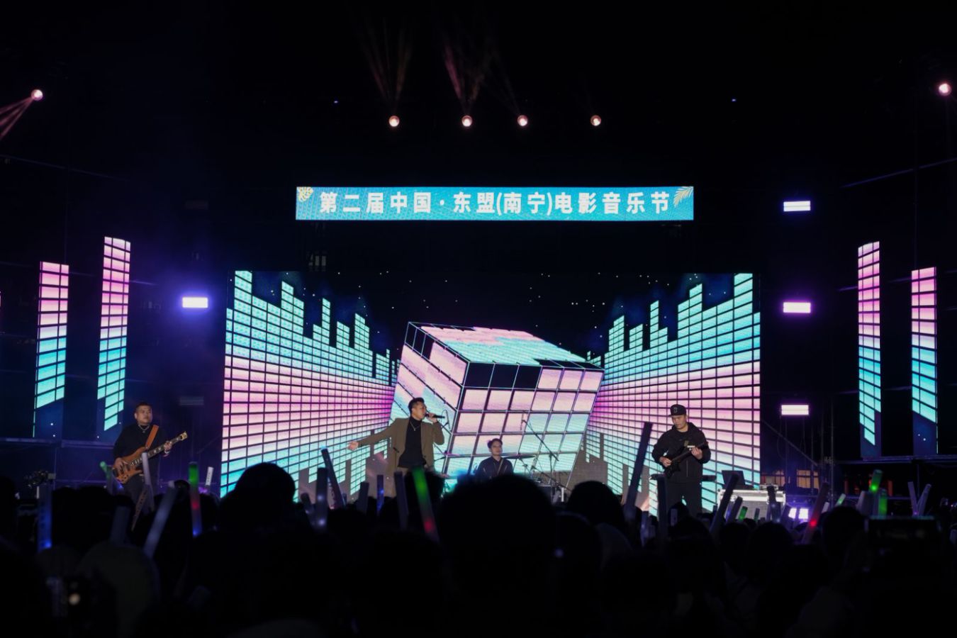 唱響冬日歡歌,共享音樂盛宴。12月14—15日,第二屆中國—東盟(南寧)電影音樂節(jié)在南寧學院、南寧職業(yè)技術(shù)大學完美開唱,兩所高校超一萬名學生參與。本屆音樂節(jié)以電影文化為主題,通過邀請區(qū)內(nèi)專業(yè)音樂組合、樂隊,攜手高校音樂愛好者,翻唱經(jīng)典電影歌曲、流行歌曲(熱歌)、本土特色原創(chuàng)音樂作品、部分東盟國家歌曲,為高校學子帶來融合唱跳、流行、說唱、搖滾等多樣化風格的演出,以歌會友、以歌傳情,相比去年,在內(nèi)容呈現(xiàn)上不僅彰顯更多電影元素,還充滿了濃濃的東盟風情,Miya樂團帶來的《泰friend》出自新民歌大會,將泰語和壯語以新民歌形式融合呈現(xiàn),表達了中國和東盟國家的深厚友誼,給學生觀眾帶來更加直觀、豐富的電影音樂文化體驗,以此促進不同文化之間的交流和融合。