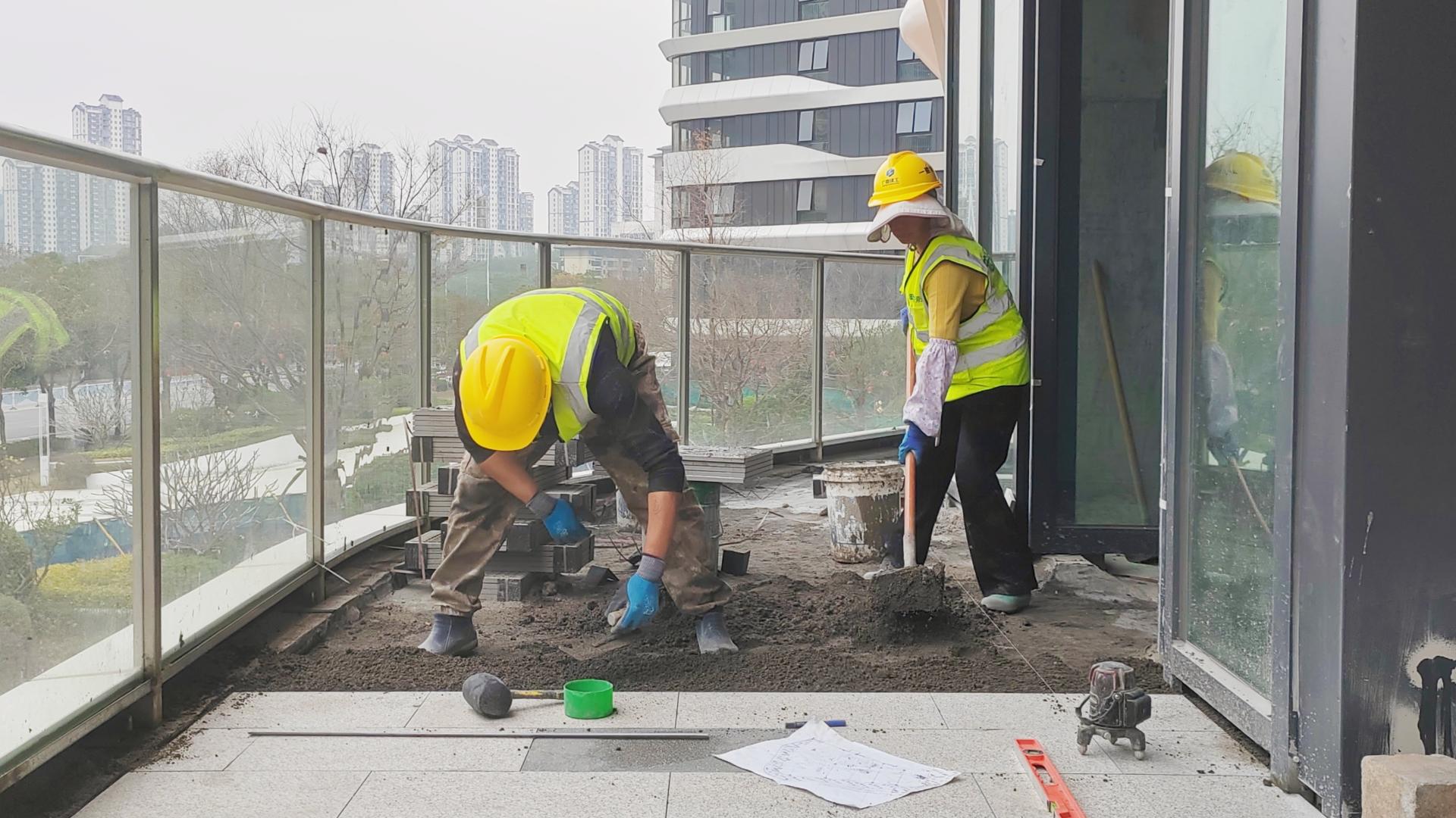 東盟威寧文創(chuàng)中心項(xiàng)目施工現(xiàn)場(chǎng)鋪設(shè)地磚