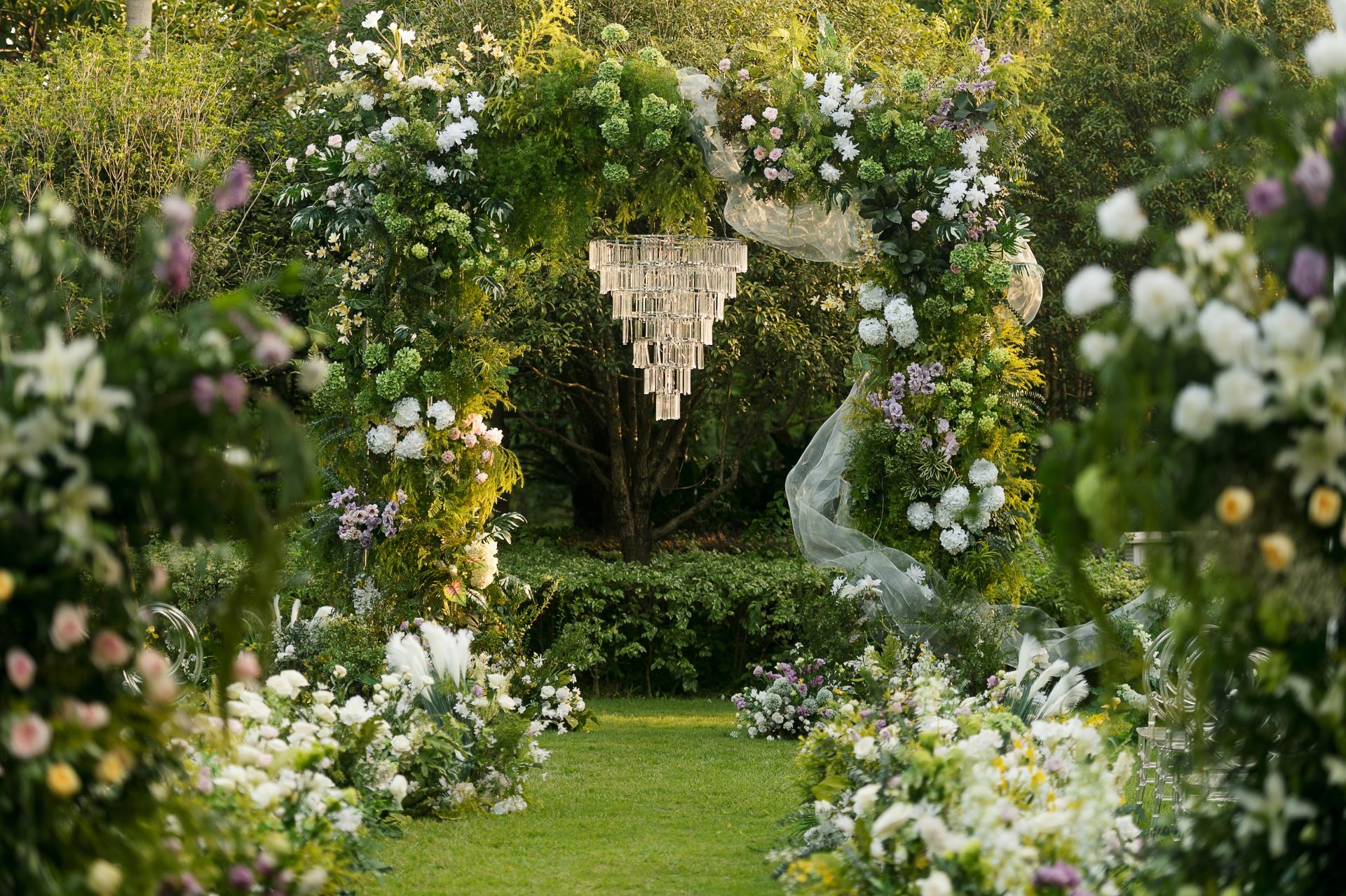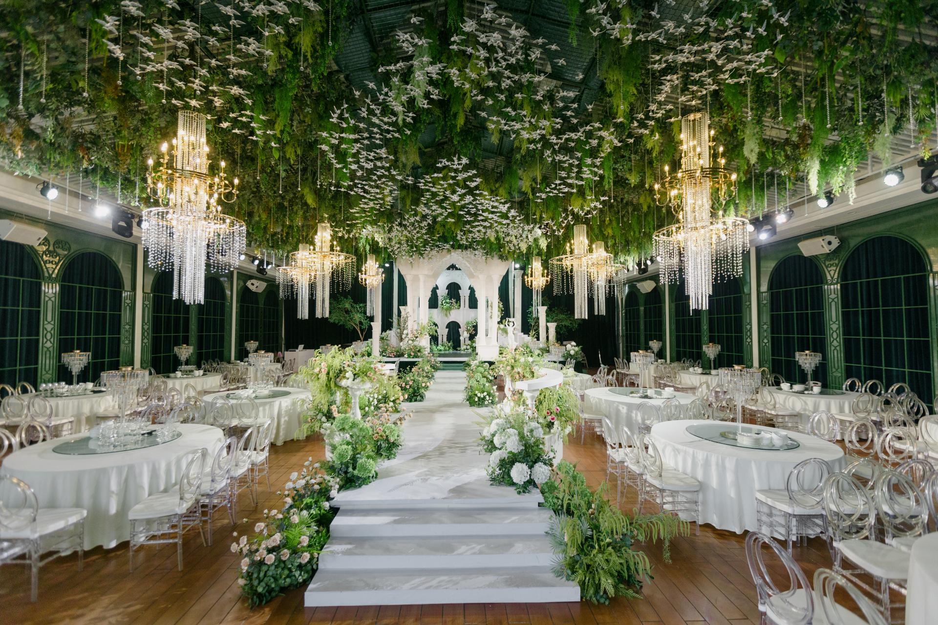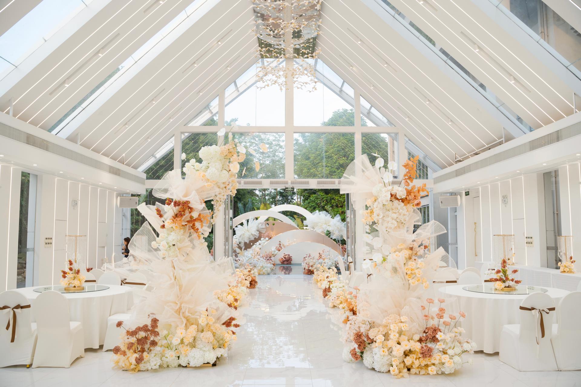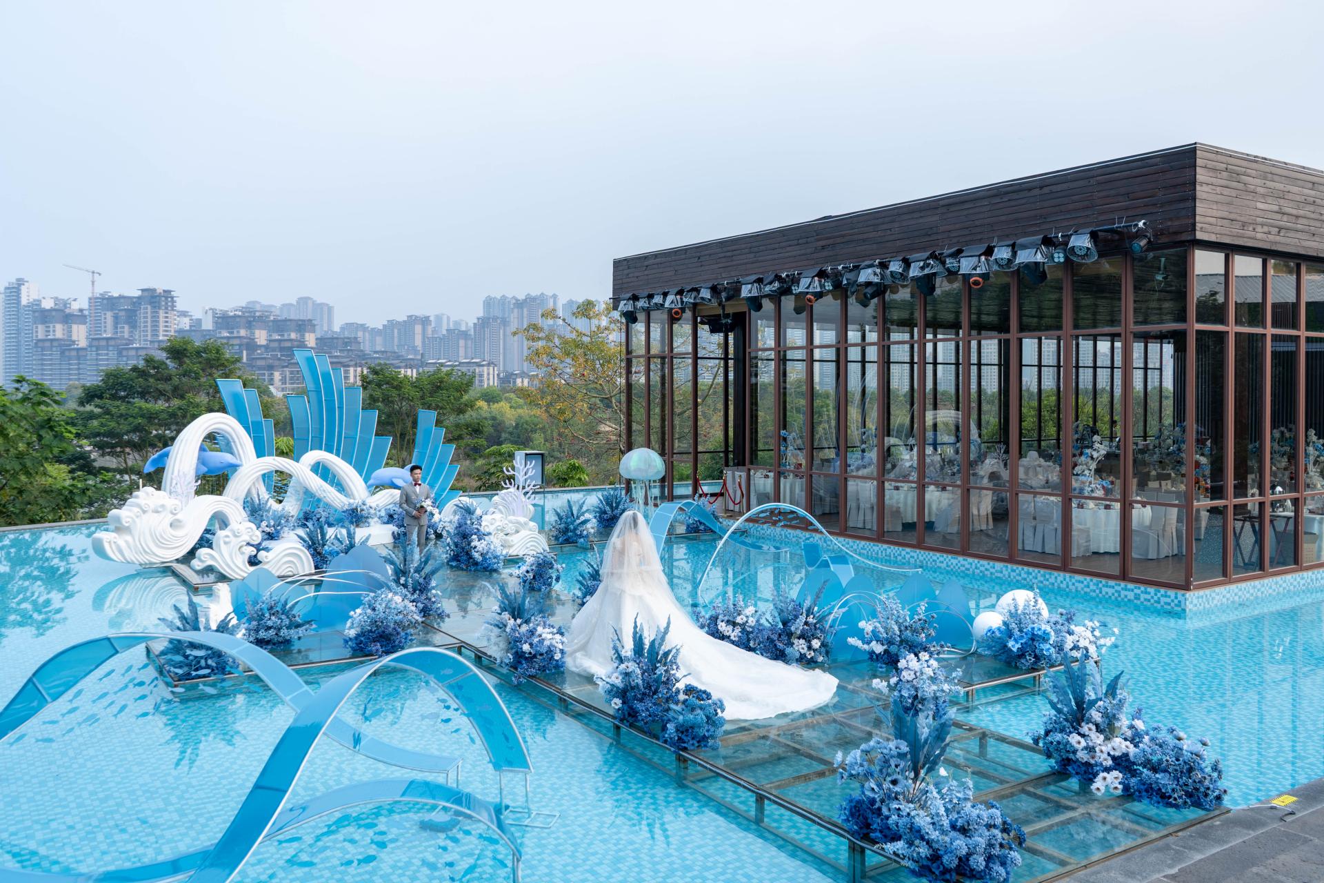 本次活動(dòng)在8號(hào)樓湖畔禮堂舉行。活動(dòng)現(xiàn)場(chǎng)布置得如夢(mèng)似幻,藍(lán)白色系的場(chǎng)景布置營(yíng)造出一種夢(mèng)幻、空靈、清澈、純凈的氛圍,令人仿佛置身于童話世界。湖畔禮堂以其獨(dú)特的水上儀式區(qū)和三面通透的玻璃墻體設(shè)計(jì),成為了現(xiàn)場(chǎng)的一大亮點(diǎn)。此外,五象山莊憑借無(wú)與倫比的自然景觀資源,精心打造了多個(gè)戶外草坪儀式區(qū),包括擁有超過(guò)1000平米的8號(hào)樓草坪和500平米的5號(hào)樓草坪,以及沉浸式婚禮堂花園廳、獨(dú)棟無(wú)柱式大宴會(huì)廳等,這些場(chǎng)地均以其開(kāi)闊的視野、優(yōu)美的自然景觀和獨(dú)特的布置風(fēng)格,為新人及賓客提供了獨(dú)一無(wú)二的背景畫(huà)卷,讓每一場(chǎng)婚禮都能享受到專(zhuān)屬的私密空間與定制服務(wù),贏得了新人們的一致好評(píng)。