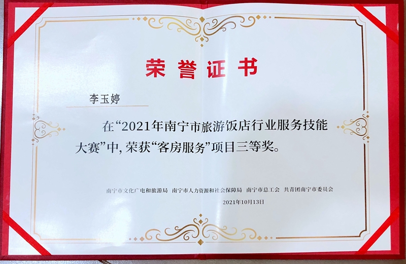 近日,銀河大酒店在由南寧市文化廣電和旅游局、人力資源和社會保障局、市總工會、共青團南寧市委員會共同主辦的2021年南寧市旅游飯店行業(yè)服務(wù)技能大賽中榮獲最佳組織獎,客房部員工李玉婷獲客房服務(wù)項目三等獎。