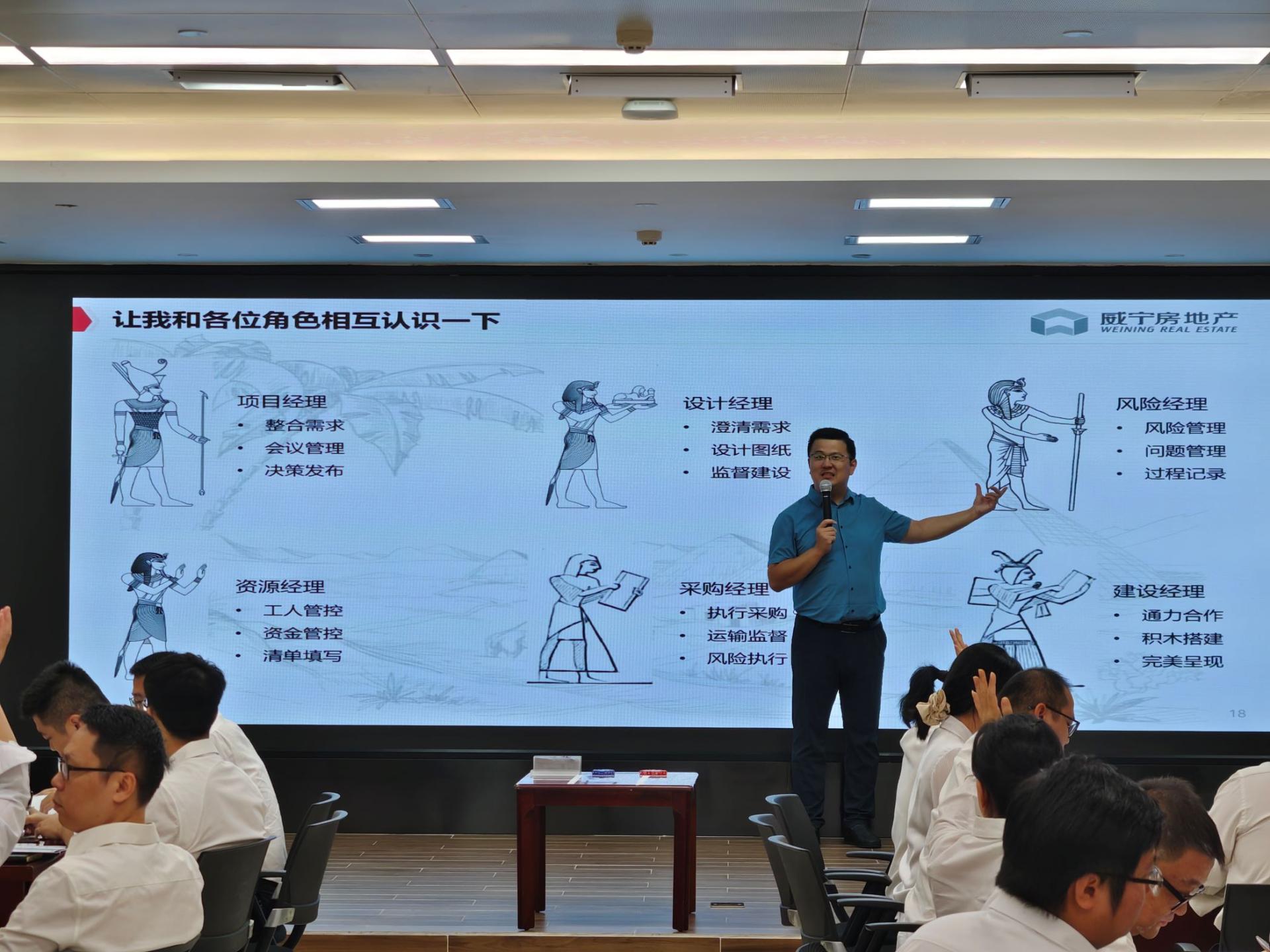 角色代入、規(guī)則制定、計劃決策、資金運轉……房地產企業(yè)經營、大運營管理、全流程沙盤管理導師李翔宇帶動盤活了一場融管理理論與實踐于一體、集角色扮演與崗位體驗于一身的《埃及金字塔:管理者項目管理能力提升沙盤》實戰(zhàn)課程,團隊學員認清規(guī)則和道具,在創(chuàng)造的待開發(fā)建設工程項目模擬場域,站在更高的“視角”,重新審視和本職工作相關的企業(yè)經營和管理思維,從收并購到現(xiàn)金流型、均衡型、利潤型房企的資金策略,再到快開盤、早回款的底層經營邏輯,在“紙上談兵”中完成對經營決策、戰(zhàn)略地圖、開發(fā)策略、投入產出、效益風險等關鍵要素的操作,各團隊全身心投入,運用頭腦風暴形式驗證每一項優(yōu)化措施,在井然有序的狀態(tài)下默契地完成生產任務,保質保量按期交付產品的同時實現(xiàn)降本盈利。在活動中,進一步提高團隊全局共識,強化團隊計劃經營意識,提升隊伍整體組織效能。