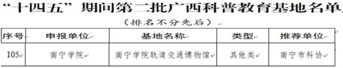2023年8月31日,廣西壯族自治區(qū)科學(xué)技術(shù)協(xié)會發(fā)布《自治區(qū)科協(xié)關(guān)于認(rèn)定“十四五”期間第二批廣西科普教育基地的通知》,由南寧市科學(xué)技術(shù)協(xié)會推薦的“南寧學(xué)院軌道交通博物館”成功獲批,這是自今年6月12日,南寧學(xué)院獲批南寧市科普教育基地之后,成功獲批廣西壯族自治區(qū)科普教育基地,實(shí)現(xiàn)一年內(nèi)連續(xù)成功獲批市級和自治區(qū)級科普教育基地的重要突破。