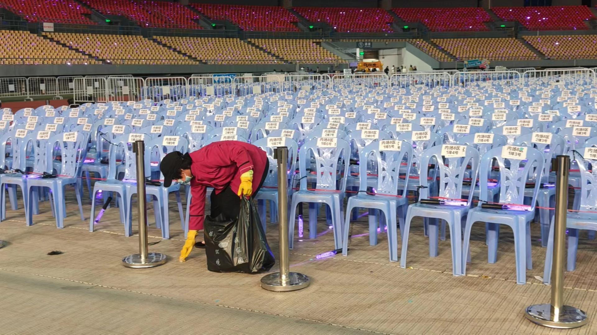 在演出籌備前夕,威凱智慧物業(yè)服務(wù)團隊累計出動120名保障人員對VIP區(qū)上萬張坐席搬運、擺放,“拉線”式調(diào)整讓場館內(nèi)座椅排列有序。