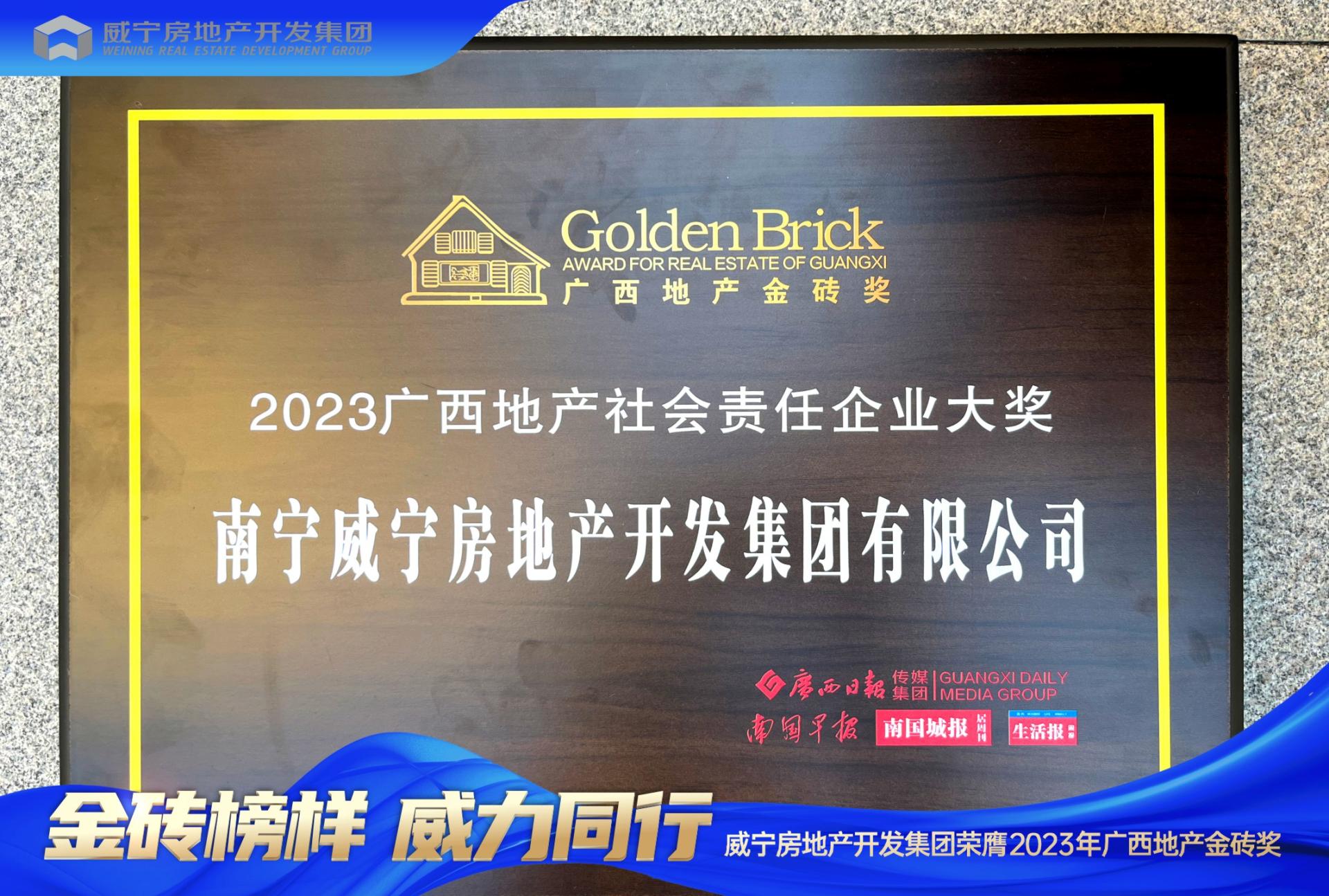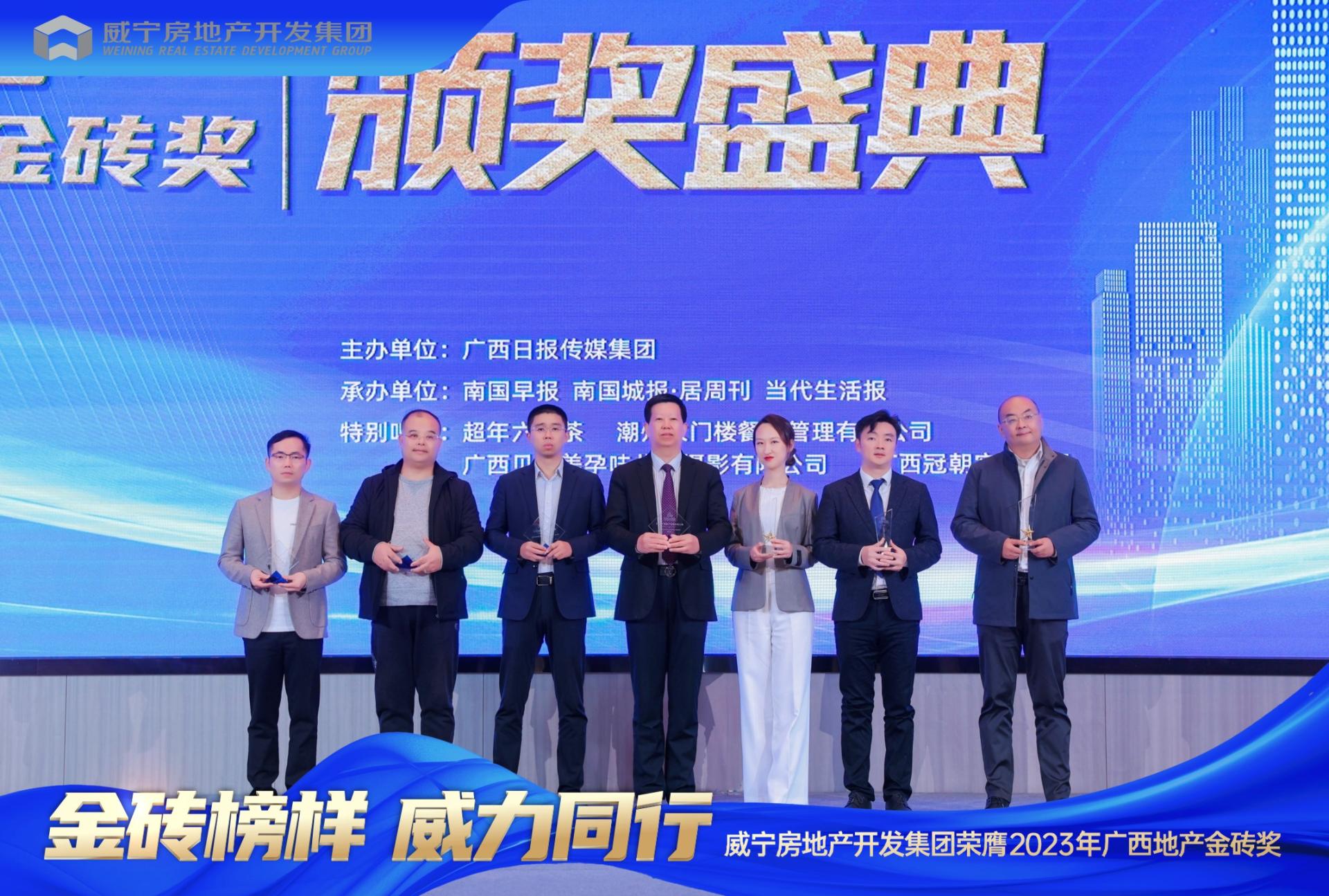 和美與共,煥新家園。2023年12月21日,由廣西日?qǐng)?bào)傳媒集團(tuán)主辦的2023年廣西地產(chǎn)金磚獎(jiǎng)?lì)C獎(jiǎng)盛典在南寧舉行。威寧房地產(chǎn)開(kāi)發(fā)集團(tuán)憑借社會(huì)責(zé)任感、交付實(shí)力、城市發(fā)展推動(dòng)力、產(chǎn)品創(chuàng)新力等多項(xiàng)指標(biāo),斬獲多項(xiàng)大獎(jiǎng),以“金磚榜樣”力量,傳遞行業(yè)正能量,引領(lǐng)行業(yè)健康發(fā)展。