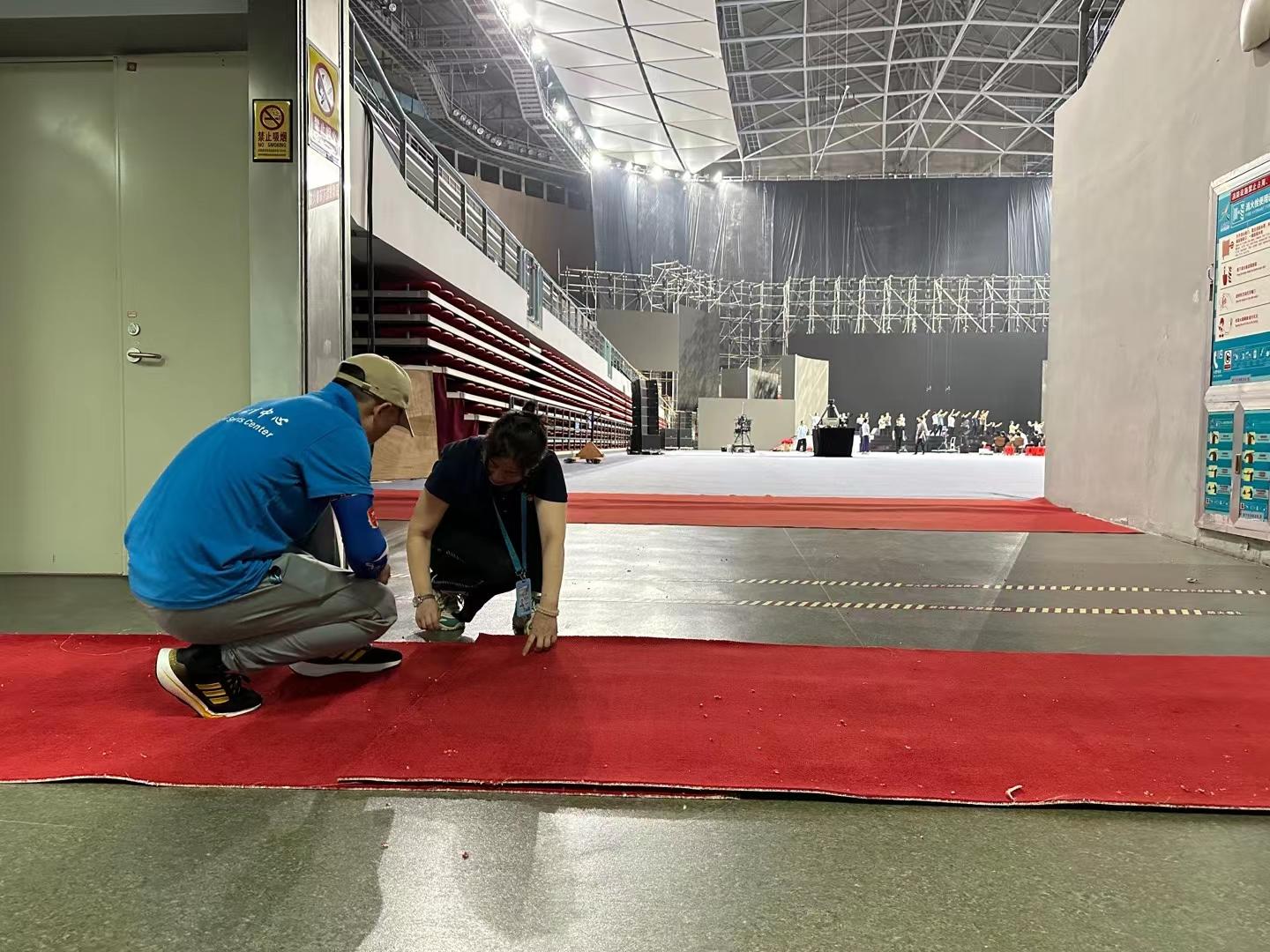 演唱會(huì)前在體育館鋪設(shè)紅地毯