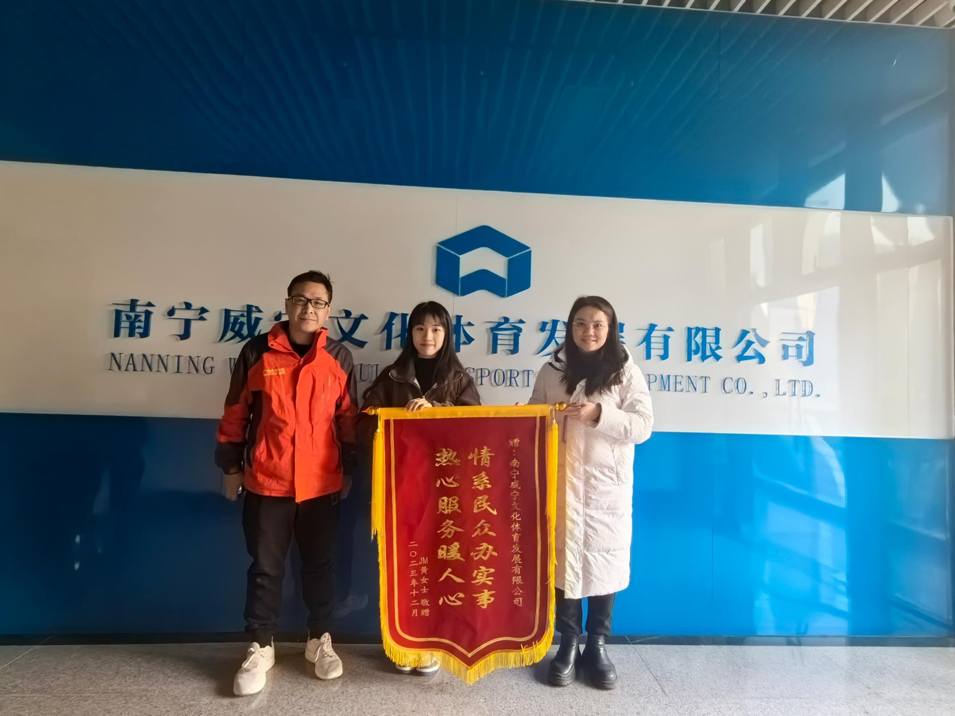 12月25日,一位在林俊杰演唱會(huì)上“失而復(fù)得”手機(jī)的觀眾給威寧文體公司送來一面錦旗,失主黃女士說,廣西體育中心給前來觀看演唱會(huì)的觀眾來帶溫暖貼心的服務(wù),讓我們感受到在這里舉辦的活動(dòng)非常安全且有保障,可以盡情享受演唱會(huì)的熱烈氣氛!