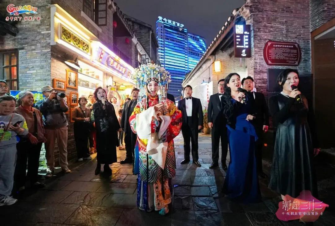 歌劇悠揚(yáng)、民歌嘹亮,一場歌劇藝術(shù)與傳統(tǒng)音樂的碰撞在邕州古城·三街兩巷激情上演。2024年4月6日晚,由中央歌劇院薛玉強(qiáng)、王霄云等多位國家一級演員和廣西本土藝術(shù)家?guī)淼摹俺逼鹑氯敝醒敫鑴≡喝罕娨魳窌阽咧莨懦恰と謨上餁v史文化街區(qū)舉行,為市民游客獻(xiàn)上了一場別開生面的街頭音樂演出。活動由廣西壯族自治區(qū)文化和旅游廳、中央歌劇院聯(lián)合主辦,南寧市文化廣電和旅游局承辦。