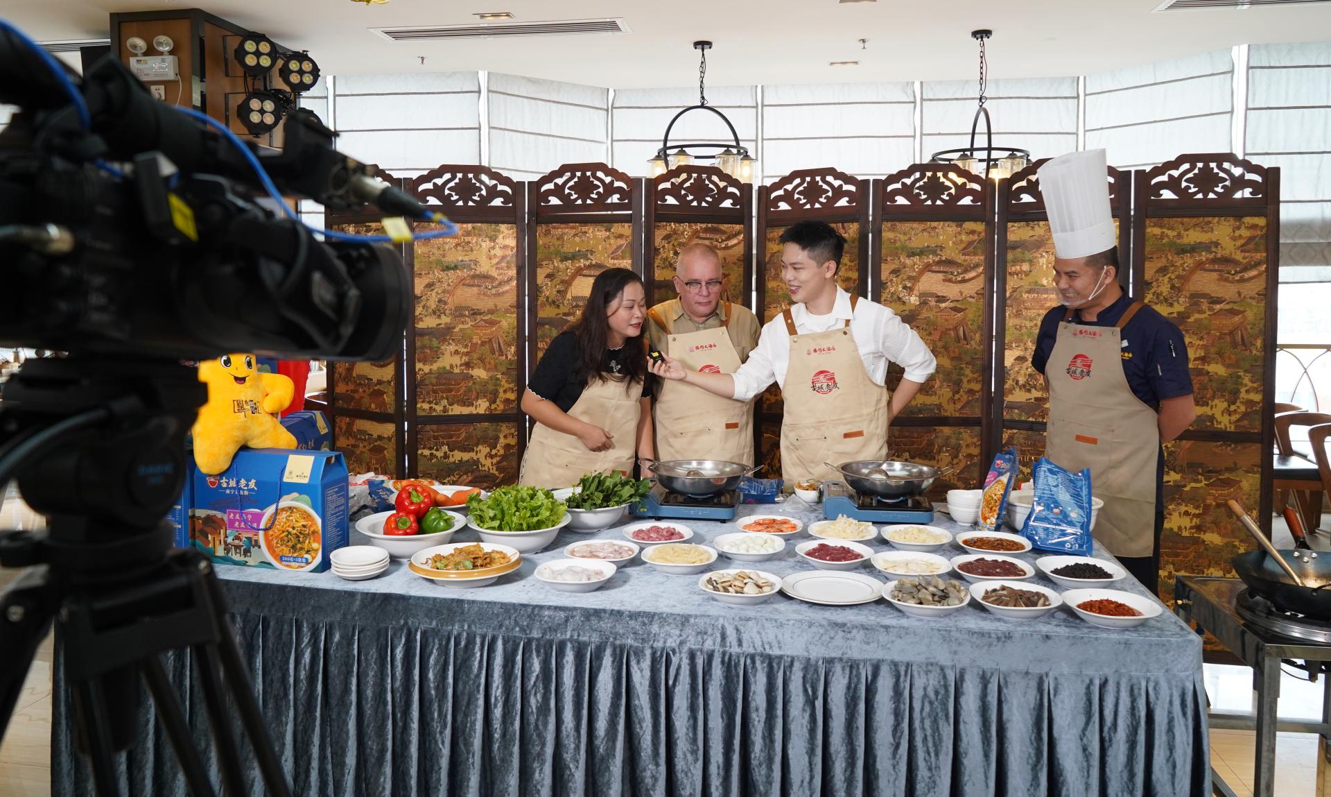 在大廚烹飪區(qū),酒店大廚展示袋裝老友粉煮制技巧,主持人楊濤邀請現(xiàn)場來自南寧和芬蘭的食客向酒店大廚學習煮制預包裝“古城老友粉”。濃郁的老友味道完全媲美門店現(xiàn)煮口感,甚至是“玩出了花”,讓外國友人也加入了嗦粉大軍。一場有“味道”的直播,向全國觀眾種草“南寧老友粉”。