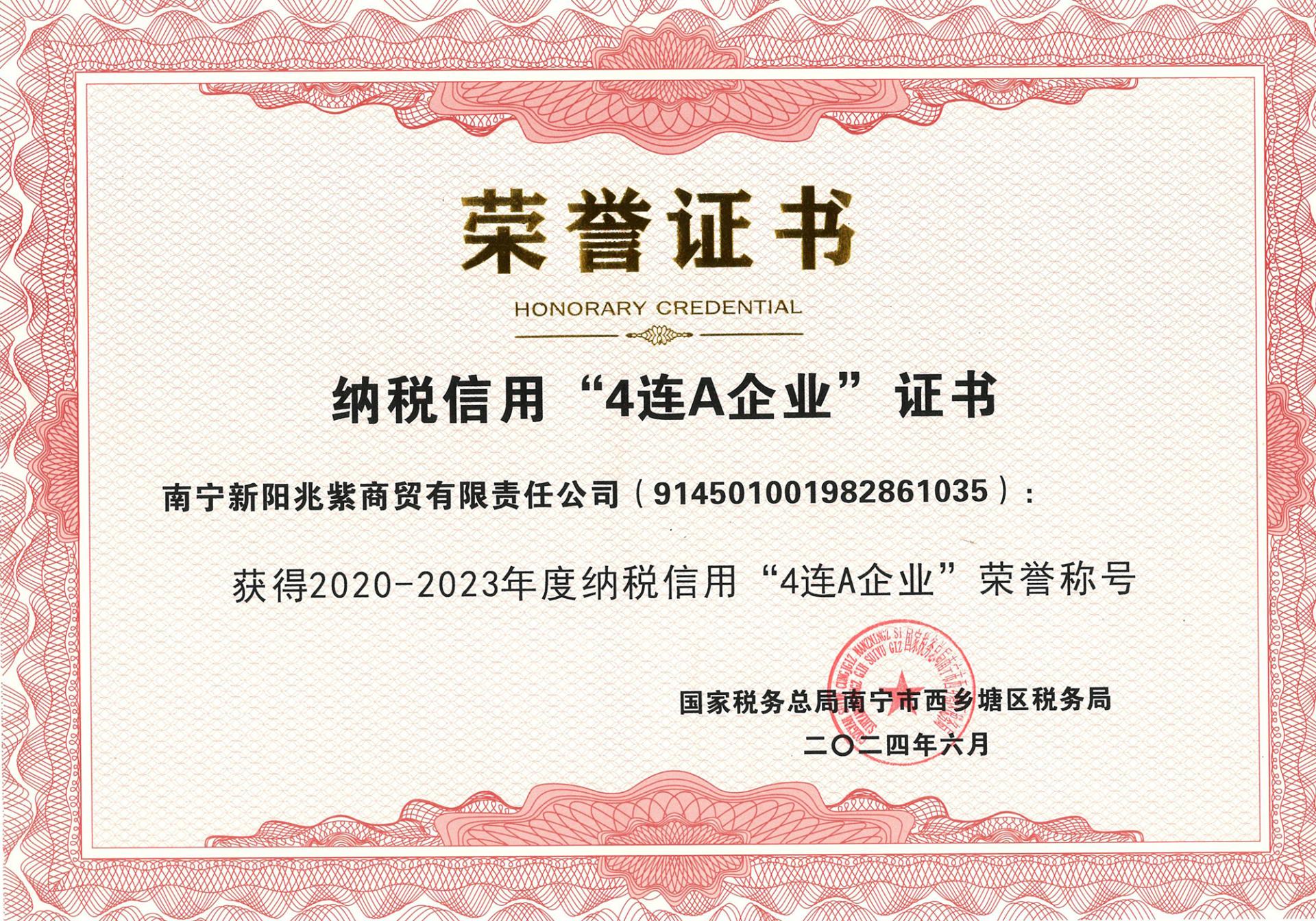 近日,威寧資產(chǎn)經(jīng)營(yíng)集團(tuán)監(jiān)管單位新陽(yáng)兆紫商貿(mào)公司榮獲國(guó)家稅務(wù)總局南寧市西鄉(xiāng)塘區(qū)稅務(wù)局頒發(fā)的2020-2023年度納稅信用“4連A企業(yè)”榮譽(yù)稱(chēng)號(hào)。