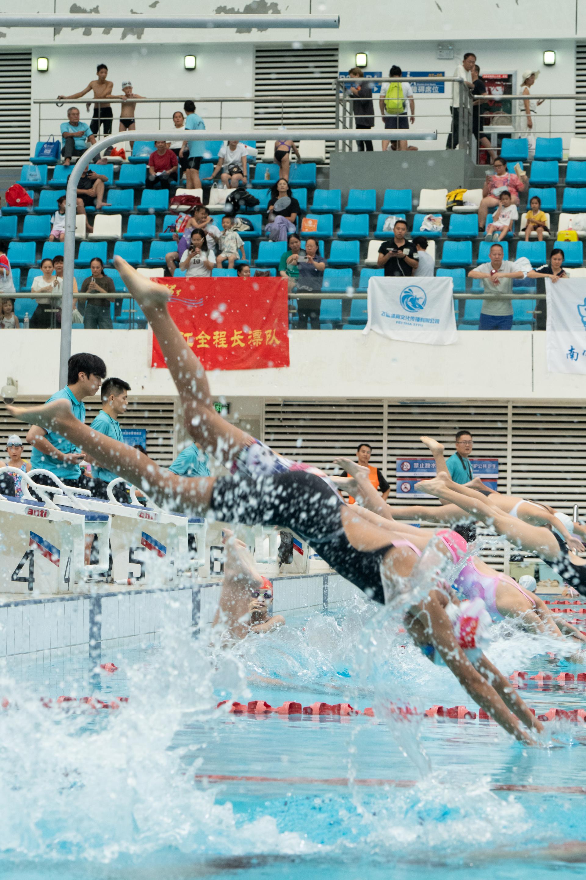 在上午九時,正式鳴哨開賽。泳池水質清澈,獎牌光彩奪目,記錄了游泳選手們奮力拼搏的雄姿。比賽首日針對青少年組別,現(xiàn)場戰(zhàn)況激烈,共角逐出了仰泳、蛙泳、蝶泳、自由泳、個人混合泳、浮標救生、自由泳接力等多個項目的33枚金牌。少年們盡顯拼搏本色,在泳道中嶄露鋒芒!