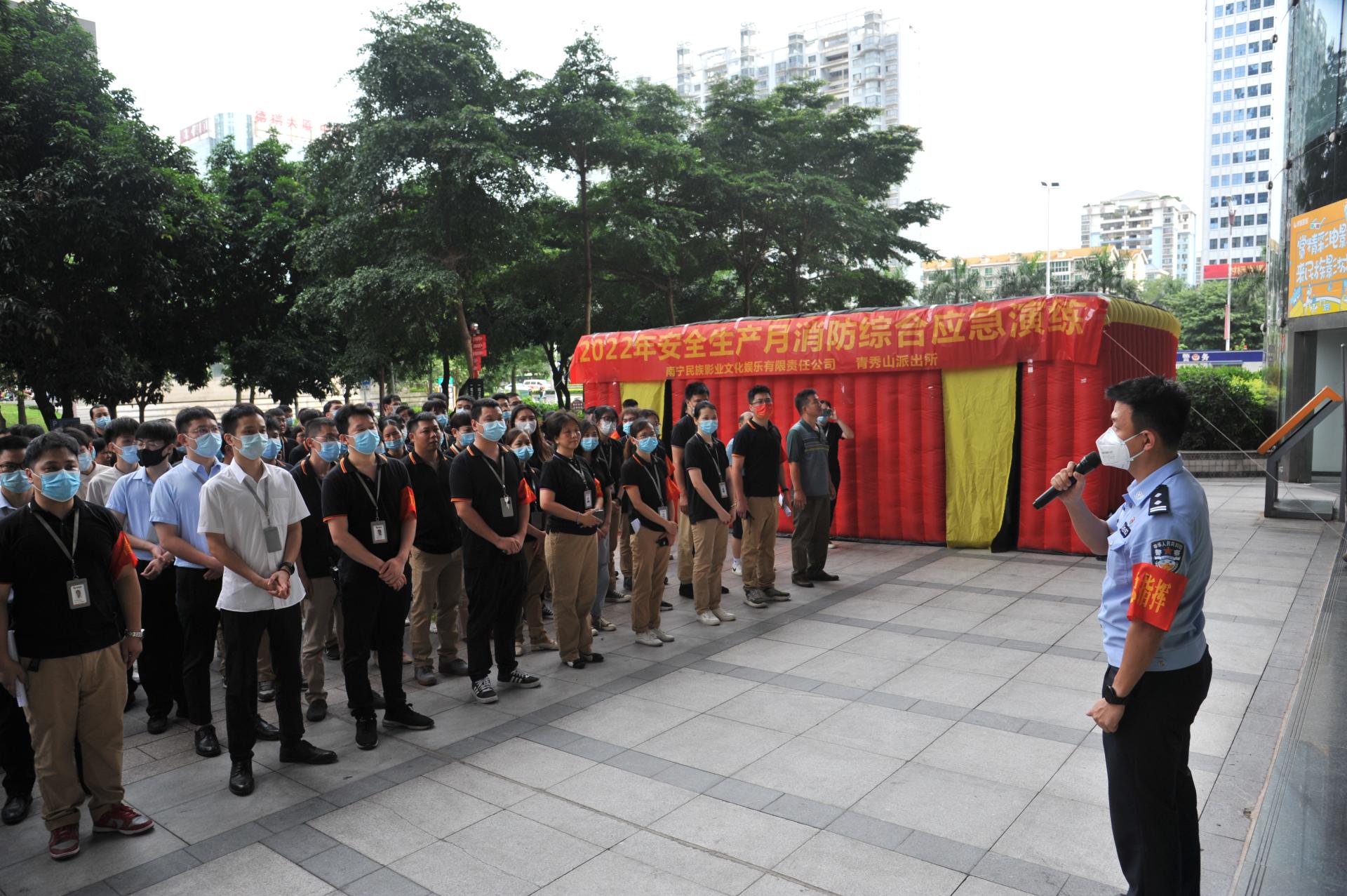 由南寧大地飛歌文化集團有限責任公司主辦(下稱南寧大地飛歌集團公司)、青秀山派出所、南寧民族影業(yè)文化娛樂有限責任公司(下稱民影公司)、南寧民族時代影業(yè)有限公司(下稱時代公司)聯(lián)合承辦的2022年“安全生產月”消防疏散防踩踏應急逃生演練,于2022年6月22日上午在民族影城舉行。南寧大地飛歌集團公司各部門負責人及員工、青秀山派出所部分民警、民影公司、時代公司全體人員、一分公司、影城各租賃企業(yè)(商戶)部分代表參加演練。