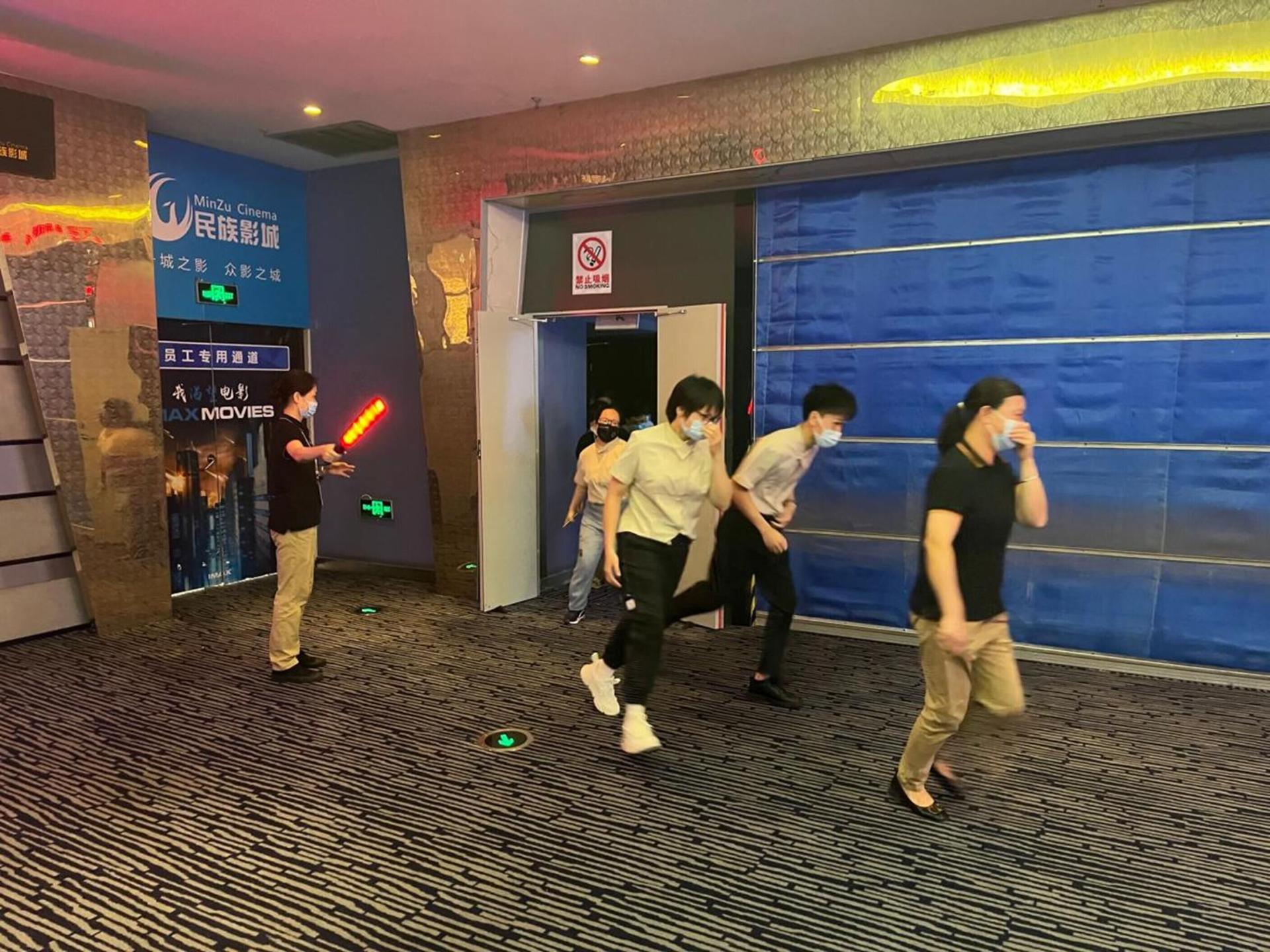上午9時,民族影城5號影廳內的觀眾正在興趣勃勃地觀看電影,接著傳來5號廳內發(fā)生“火情”,現(xiàn)場利用仿生模擬道具造出煙霧后,廳內警鈴大作,播出緊急疏散觀眾的通知。同時,影廳工作人員迅速來到廳內,告訴觀眾影廳內發(fā)生“火情”,引導大家彎著腰,捂住口鼻,屏住呼吸,沿著指示標志的指向外走。在現(xiàn)場服務員的引導下,觀眾們有序朝影廳外撤離疏散,隨后民族影城消防志愿隊成員也已經(jīng)趕到起火現(xiàn)場,迅速打開廳內消火栓水龍頭滅火,火勢很快便得到控制并逐漸熄滅。