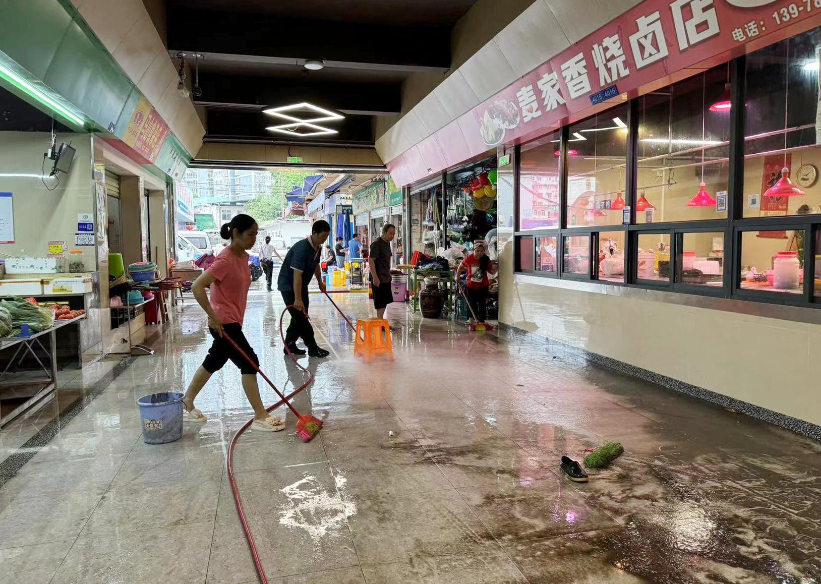 市場管理員與經(jīng)營戶開展衛(wèi)生大掃除