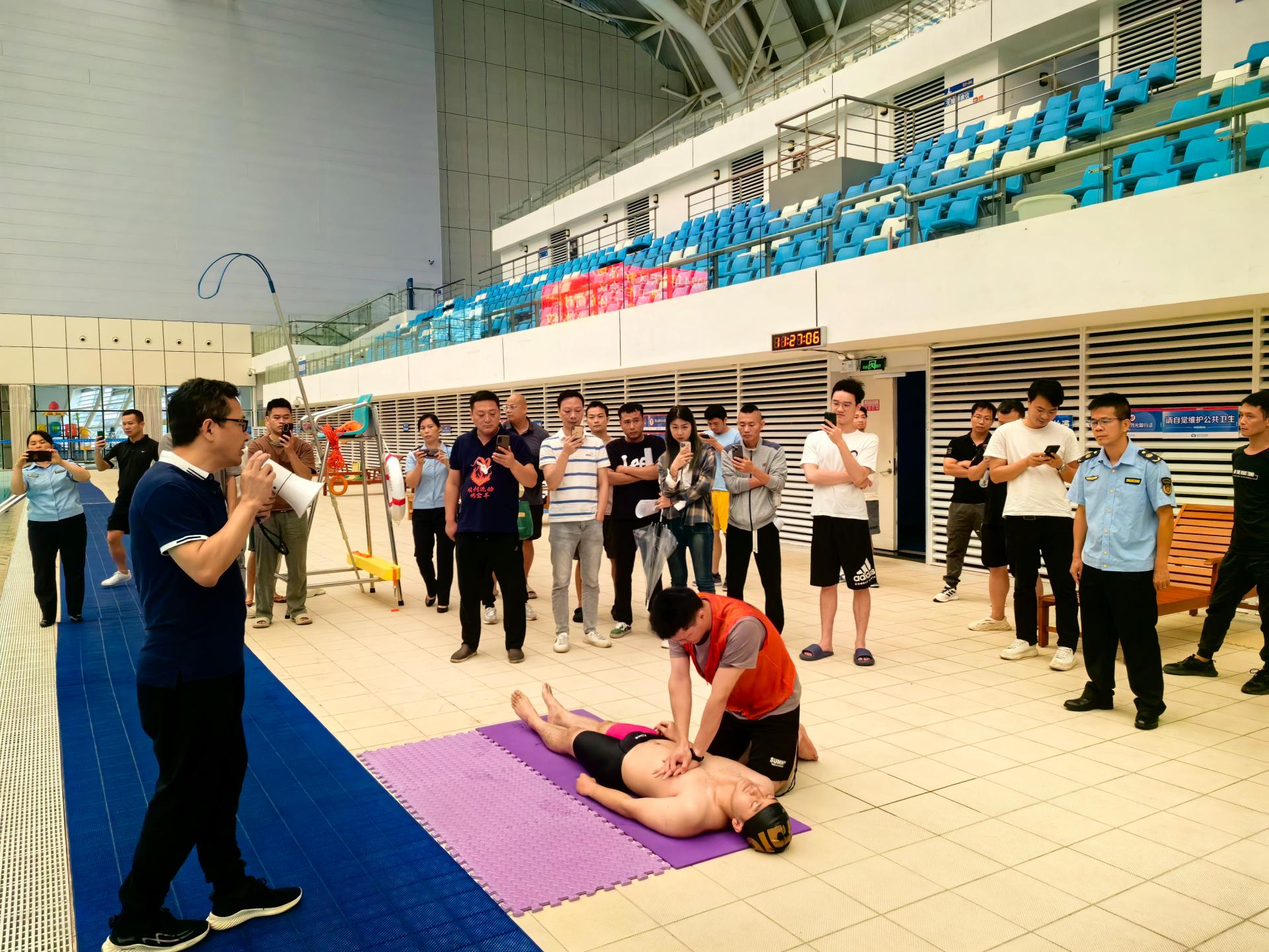 會后,廣西體育中心游泳館救生員進行防溺水應急救援演練,模擬救生員對不慎落水的“游客”進行施救的情景。同時,還現(xiàn)場演示了如何進行心肺復蘇、協(xié)同救援等工作流程,切實提高游泳救生員的專業(yè)救助能力。
