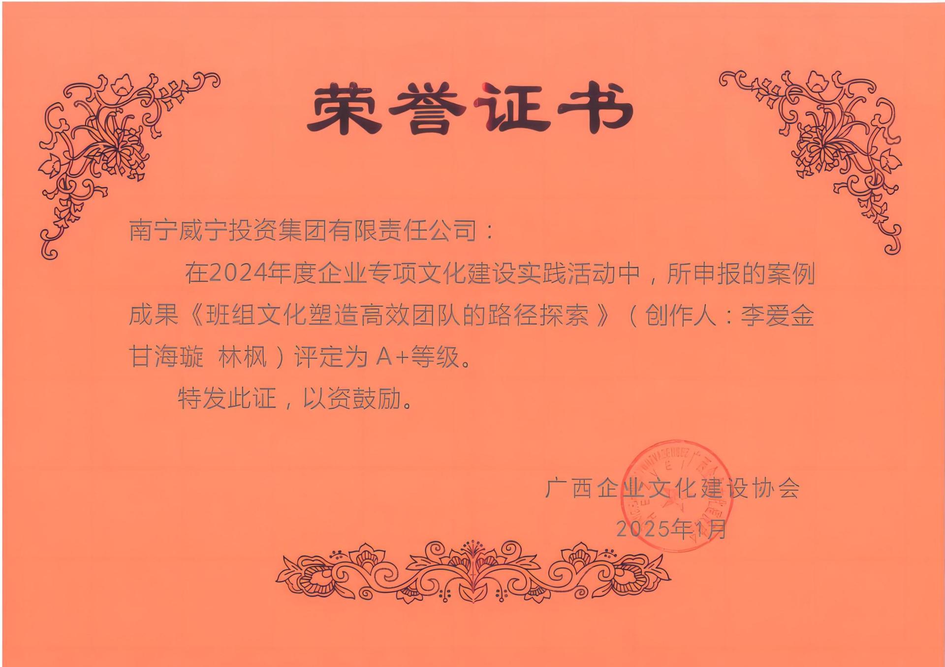 2025年1月14日,南寧威寧集團(tuán)申報(bào)的2024專項(xiàng)文化建設(shè)實(shí)踐課題成果《班組文化塑造高效團(tuán)隊(duì)的路徑探索》獲評(píng)A+等級(jí),并受邀在廣西企業(yè)文化建設(shè)協(xié)會(huì)2024年度工作總結(jié)交流研討會(huì)上進(jìn)行典型經(jīng)驗(yàn)分享。