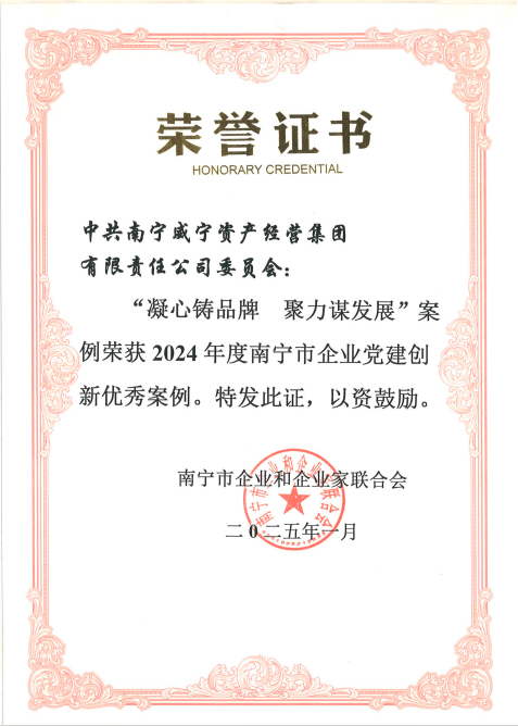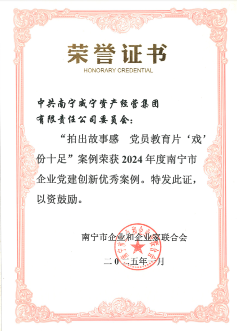 近日,威寧資產(chǎn)經(jīng)營集團黨委“凝心鑄品牌 聚力謀發(fā)展”和“拍出故事感 黨員教育片‘戲’份十足”2個黨建品牌項目榮獲南寧市企業(yè)和企業(yè)家聯(lián)合會頒發(fā)的2024年度南寧市企業(yè)黨建創(chuàng)新優(yōu)秀案例獎項。