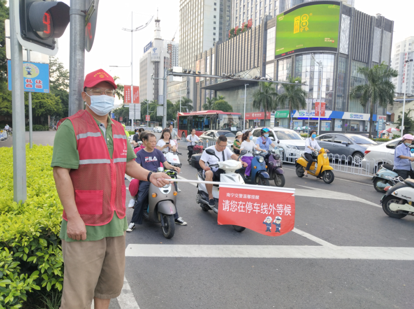 在開展創(chuàng)建文明城工作中,道路文明交通、公共秩序是城市文明的具體表現(xiàn),為充分發(fā)揮黨員志愿者模范帶頭作用,秉承志愿服務(wù)精神,助力南寧市創(chuàng)建全國(guó)文明城市的工作,連日來(lái),五象山莊黨支部、生態(tài)園公司黨支部、銀河公司黨支部組織黨員在民族大道,開展文明交通勸導(dǎo)志愿服務(wù)活動(dòng)。在交通勸導(dǎo)工作中,黨員志愿者亮身份、道文明、付行動(dòng),積極開展道路交通文明引導(dǎo),“你好,請(qǐng)退回停止線內(nèi)”、“你好,過(guò)馬路請(qǐng)走斑馬線……”。黨員志愿者們頭戴小紅帽、身穿紅馬夾、手持小旗子,在繁忙的交通路口,一遍又一遍重復(fù)著文明交通勸導(dǎo)的話語(yǔ),在城市繁忙的交通路口形成了一道靚麗的風(fēng)景線。