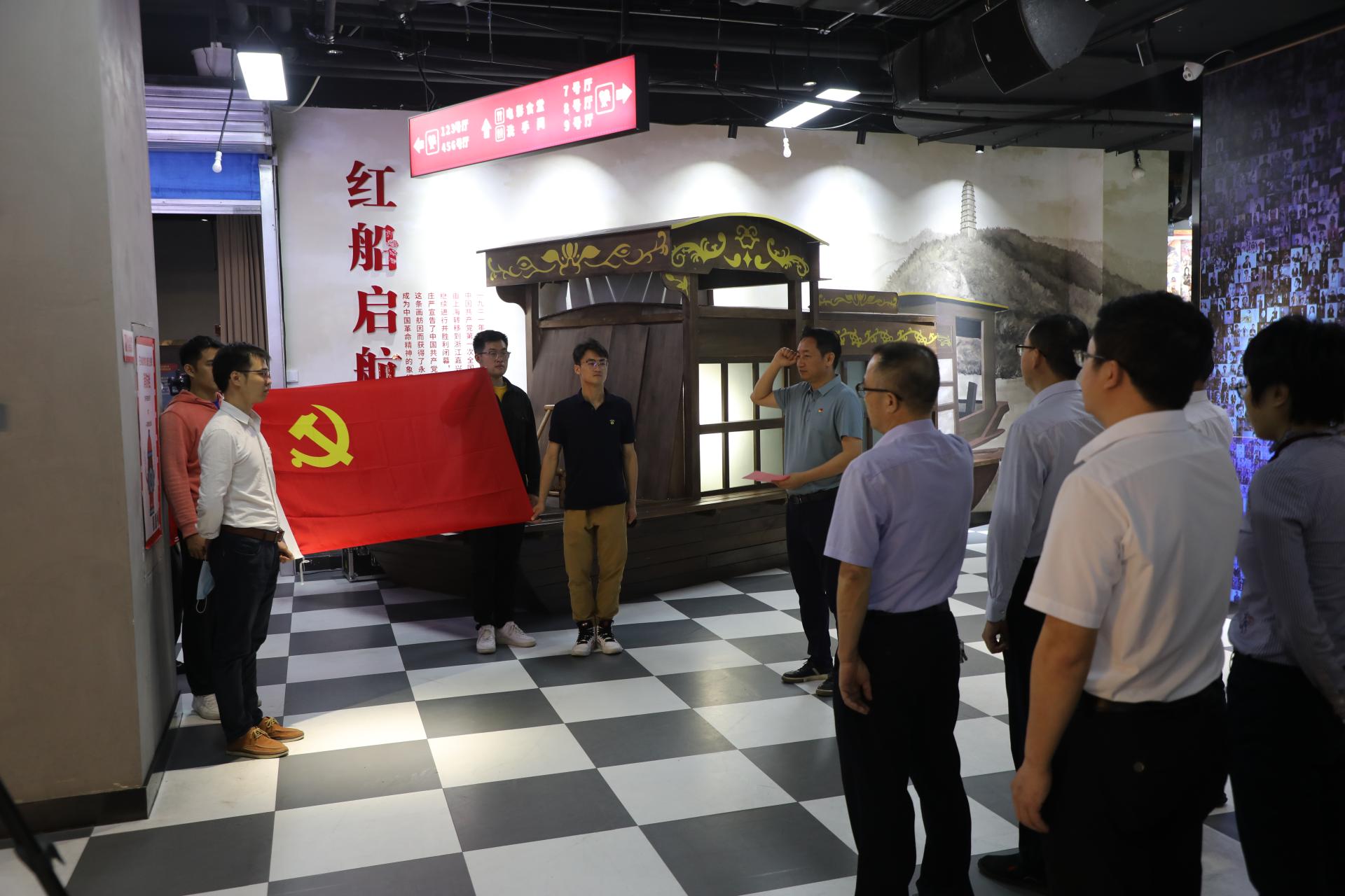 沉浸式黨課后,集團(tuán)黨委副書(shū)記馬超毅到“嘉興紅船”劇情點(diǎn),帶領(lǐng)全體黨員面向黨旗,重溫入黨誓詞?!拔抑驹讣尤胫袊?guó)共產(chǎn)黨,擁護(hù)黨的綱領(lǐng),遵守黨的章程……為共產(chǎn)主義奮斗終身,隨時(shí)準(zhǔn)備為黨和人民犧牲一切,永不叛黨?!辩H鏘有力的宣誓聲響徹大廳,久久回蕩。
