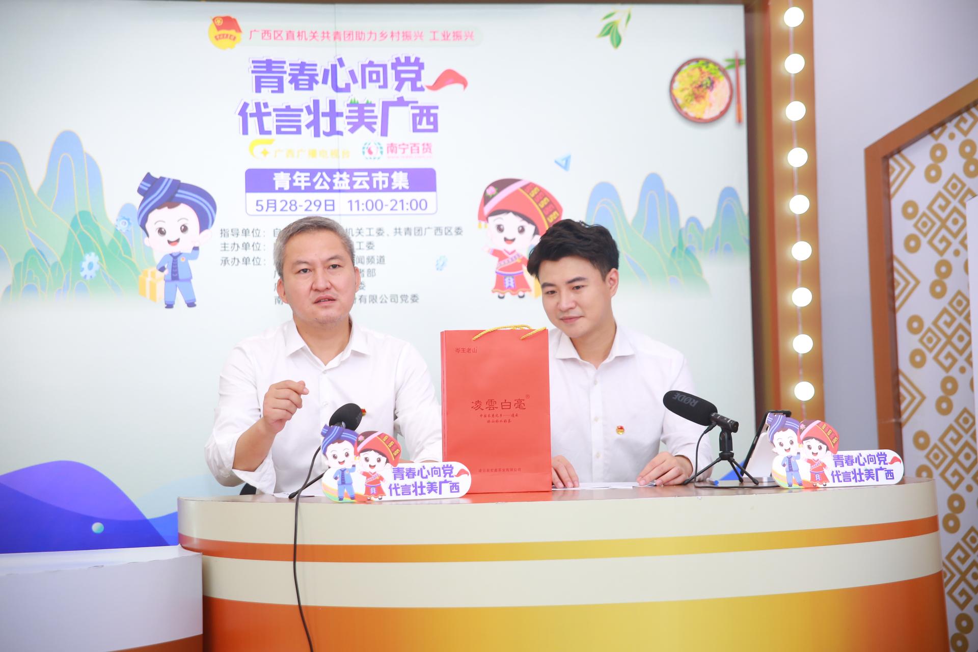 廣西區(qū)直機(jī)關(guān)團(tuán)工委書記 焦成舉(左)推薦“凌云白毫老山金螺茶葉”
