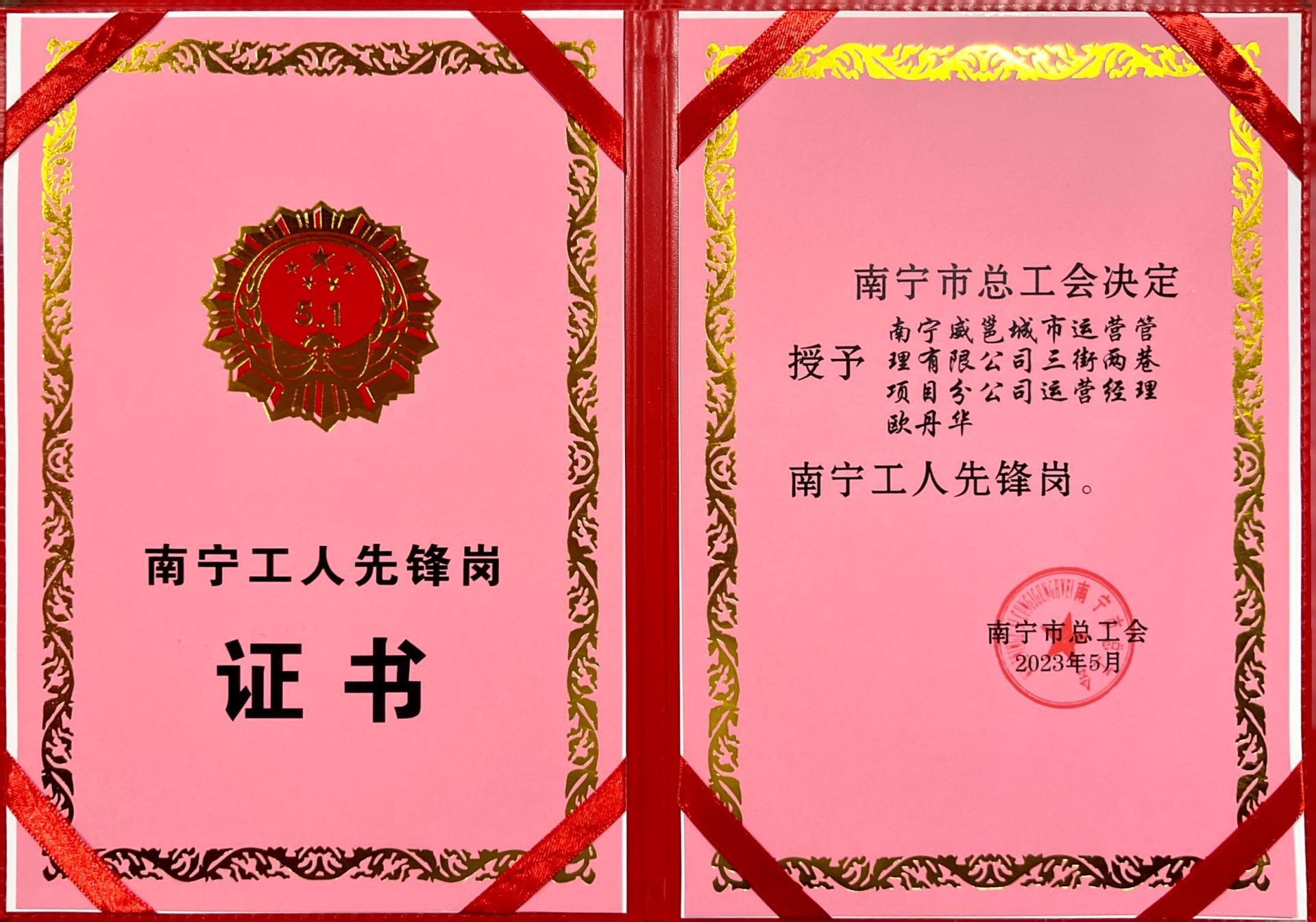近日,南寧威邕城市運(yùn)營管理集團(tuán)有限公司三街兩巷項(xiàng)目分公司運(yùn)營經(jīng)理歐丹華榮獲2023年南寧“工人先鋒崗”稱號(hào)。