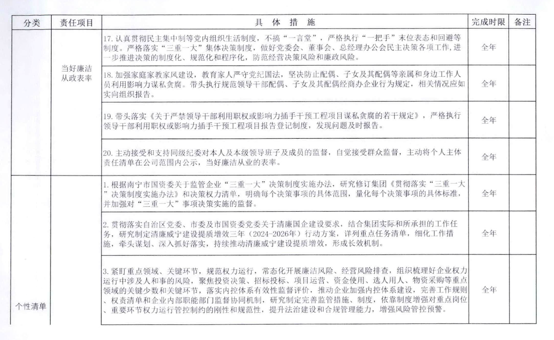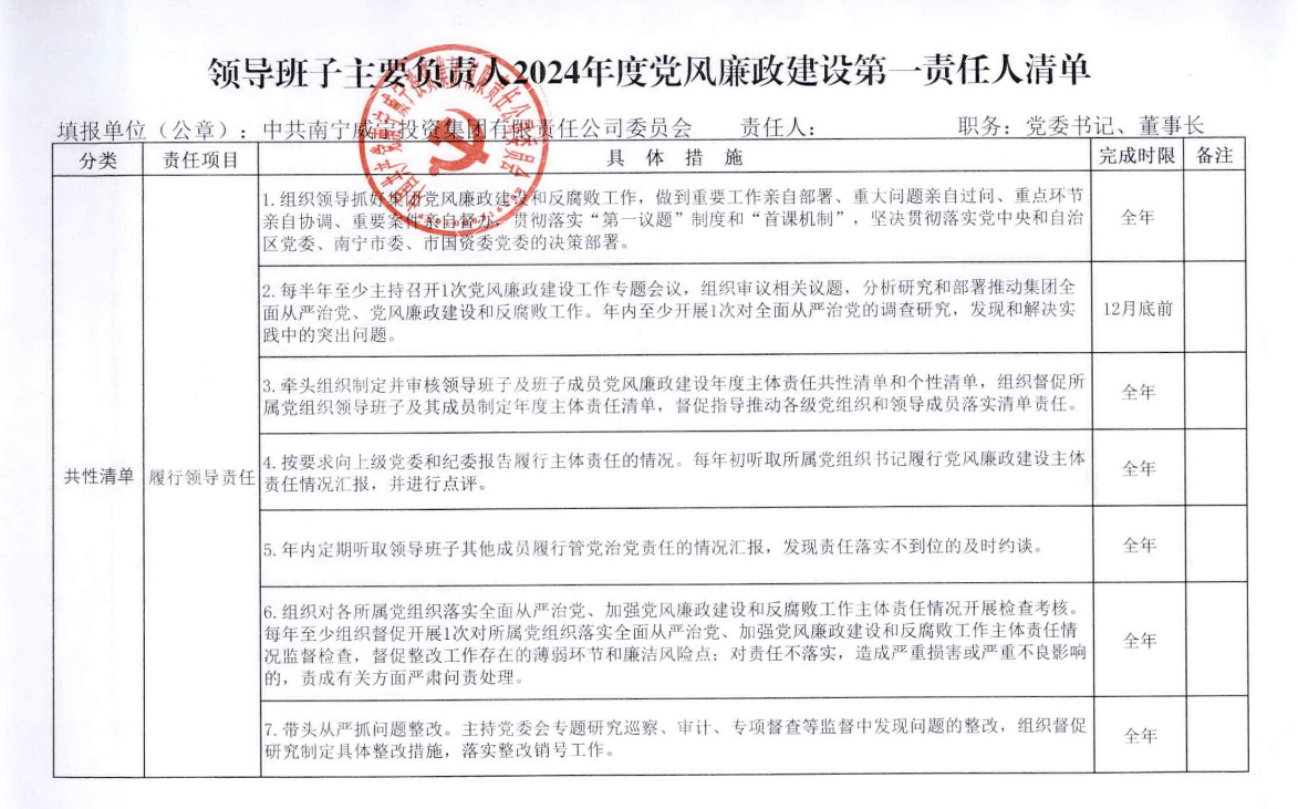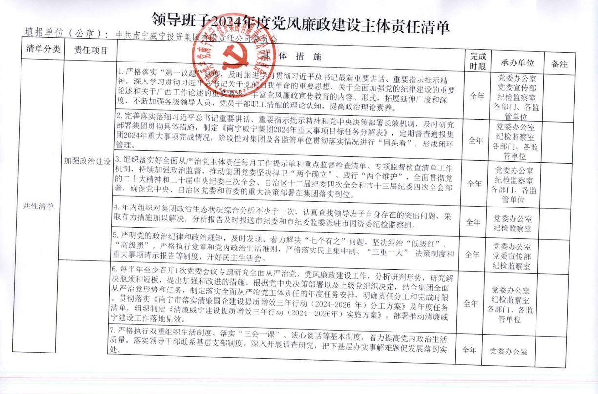 南寧威寧集團(tuán)2024年黨風(fēng)廉政建設(shè)領(lǐng)導(dǎo)班子、主要負(fù)責(zé)人及其他班子成員主體責(zé)任清單