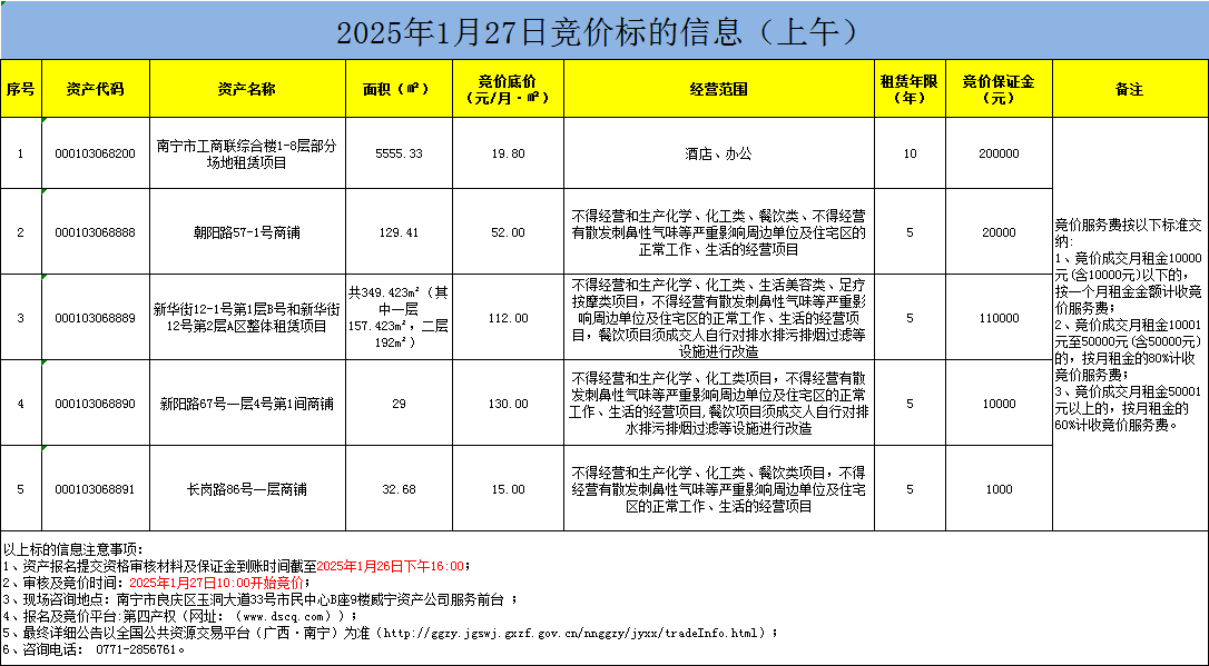 2025年1月27日競價標的信息(線上競價)