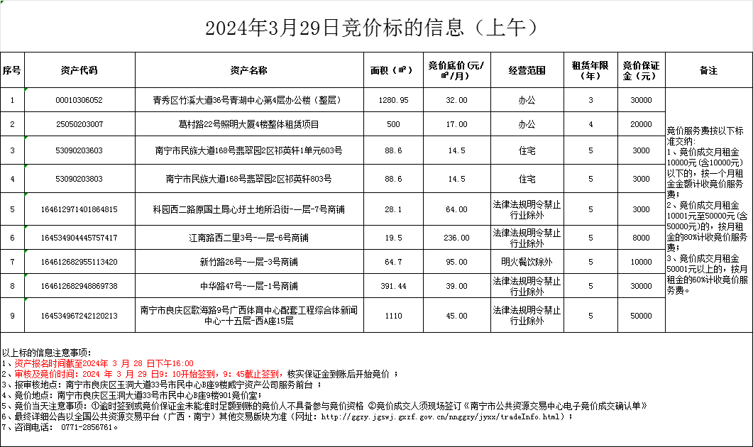 2024年3月29日競(jìng)價(jià)標(biāo)的信息(現(xiàn)場(chǎng)競(jìng)價(jià))