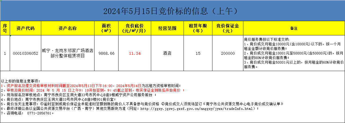 2024年5月15日競(jìng)價(jià)標(biāo)的信息(現(xiàn)場(chǎng)競(jìng)價(jià))