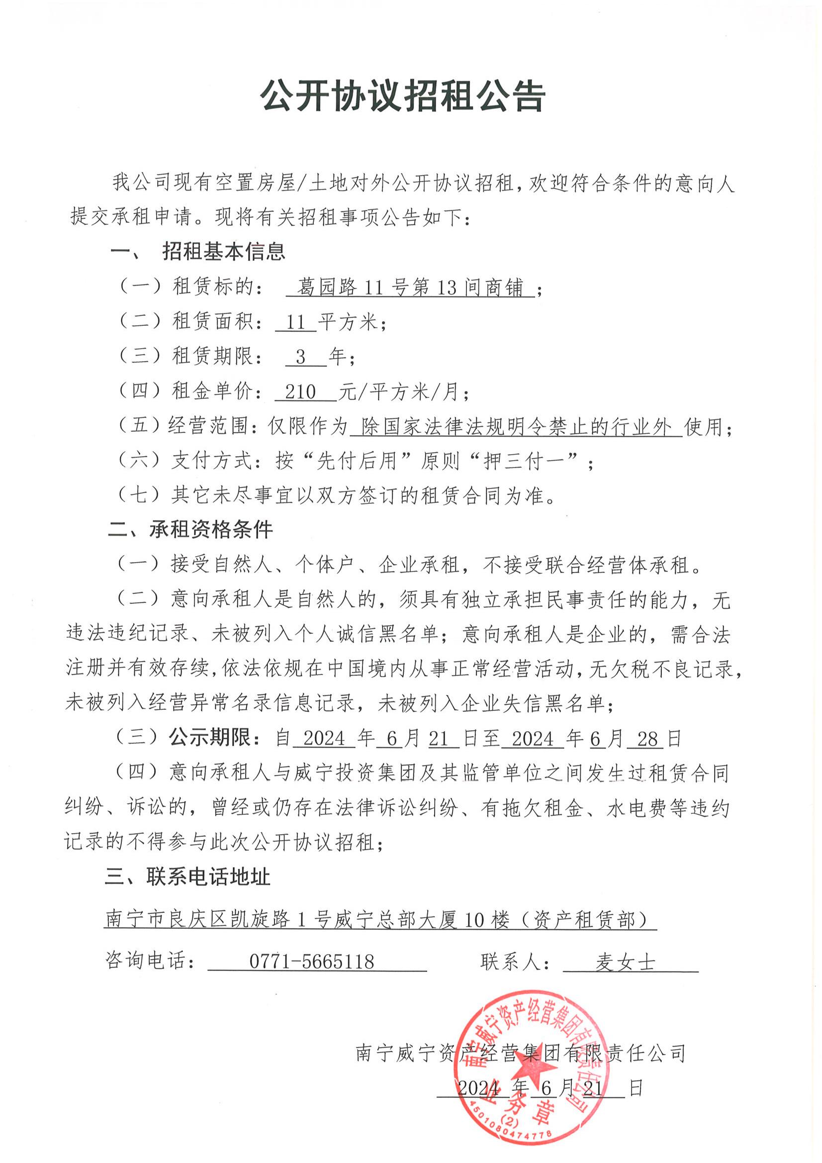 葛園路11號(hào)第13間商鋪公開協(xié)議招租公告