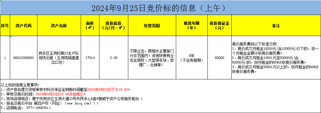 2024年9月25日競價標(biāo)的信息(線上競價)
