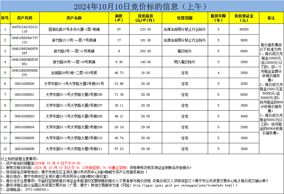 2024年10月10日競(jìng)價(jià)標(biāo)的信息(現(xiàn)場(chǎng)競(jìng)價(jià))