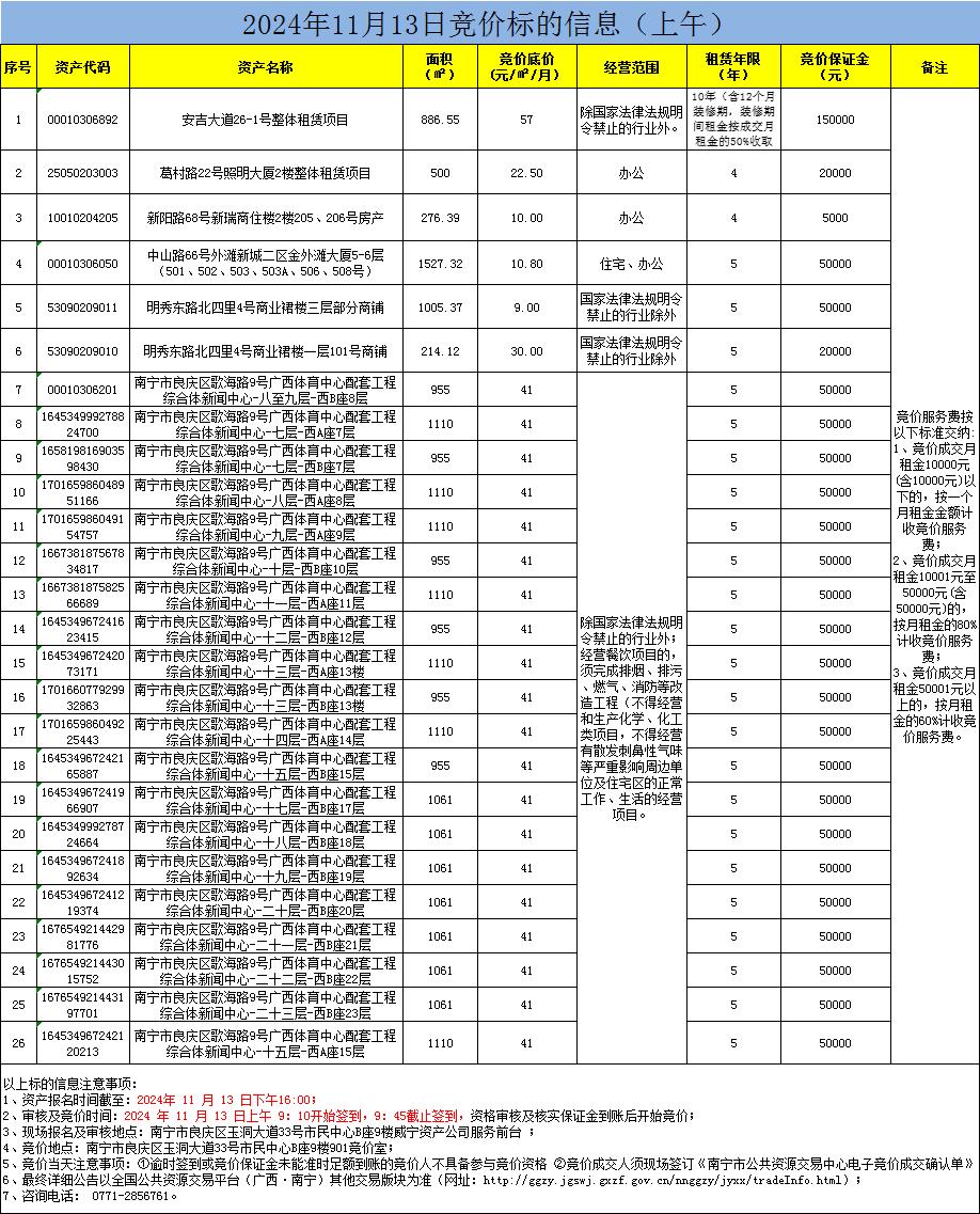 2024年11月13日競(jìng)價(jià)標(biāo)的信息(現(xiàn)場(chǎng)競(jìng)價(jià))