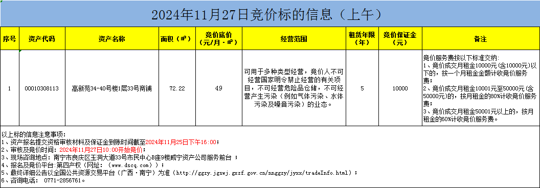 2024年11月27日競(jìng)價(jià)標(biāo)的信息(線上競(jìng)價(jià))
