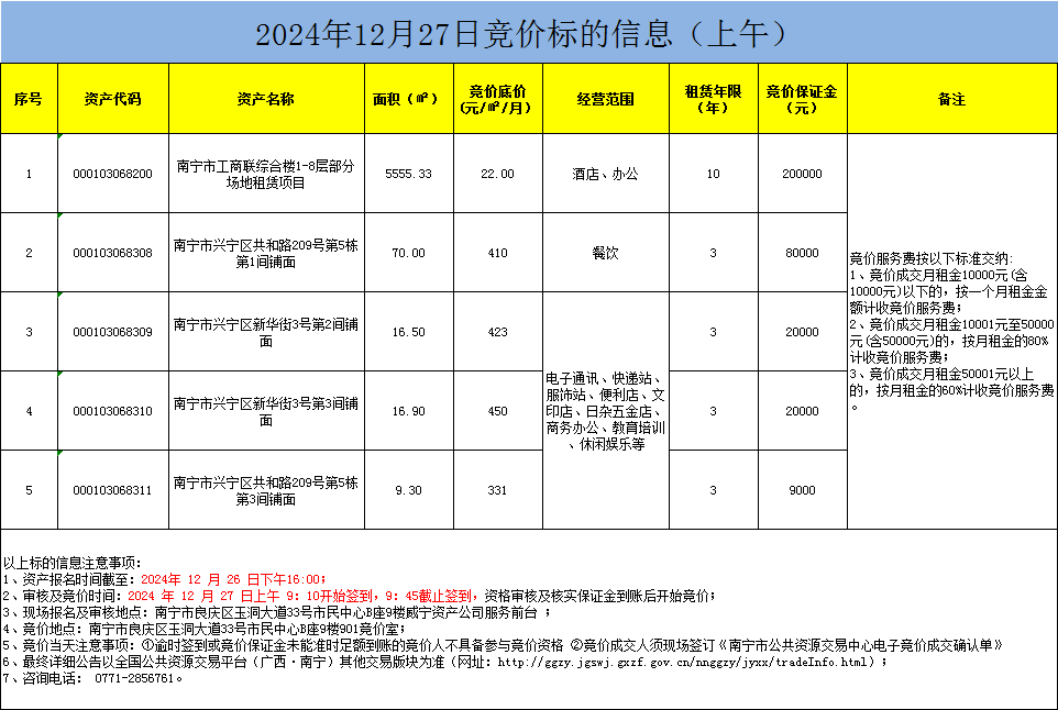 2024年12月27日競(jìng)價(jià)標(biāo)的信息(現(xiàn)場(chǎng)競(jìng)價(jià))
