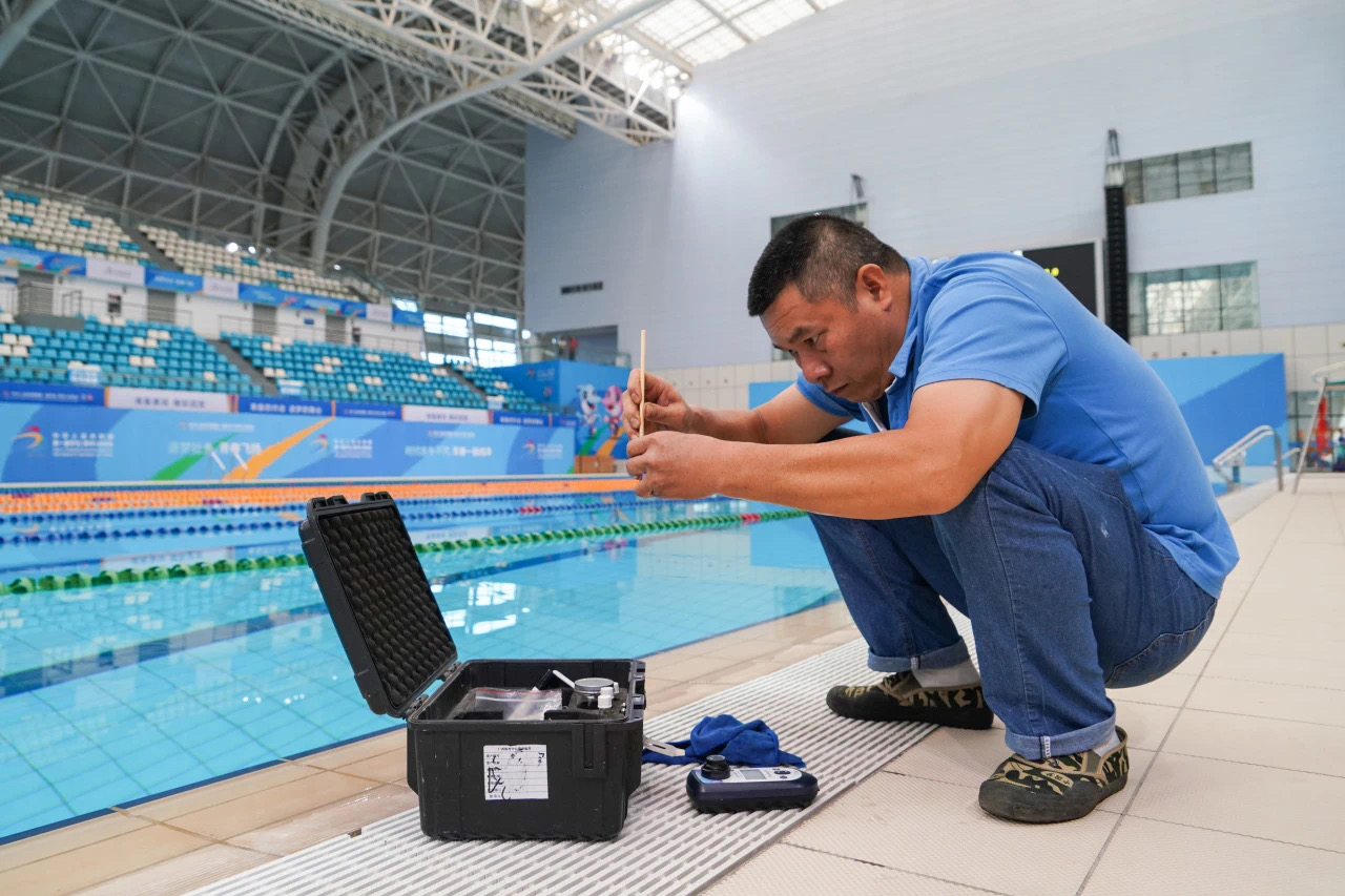 工作人員對水池水質進行檢測