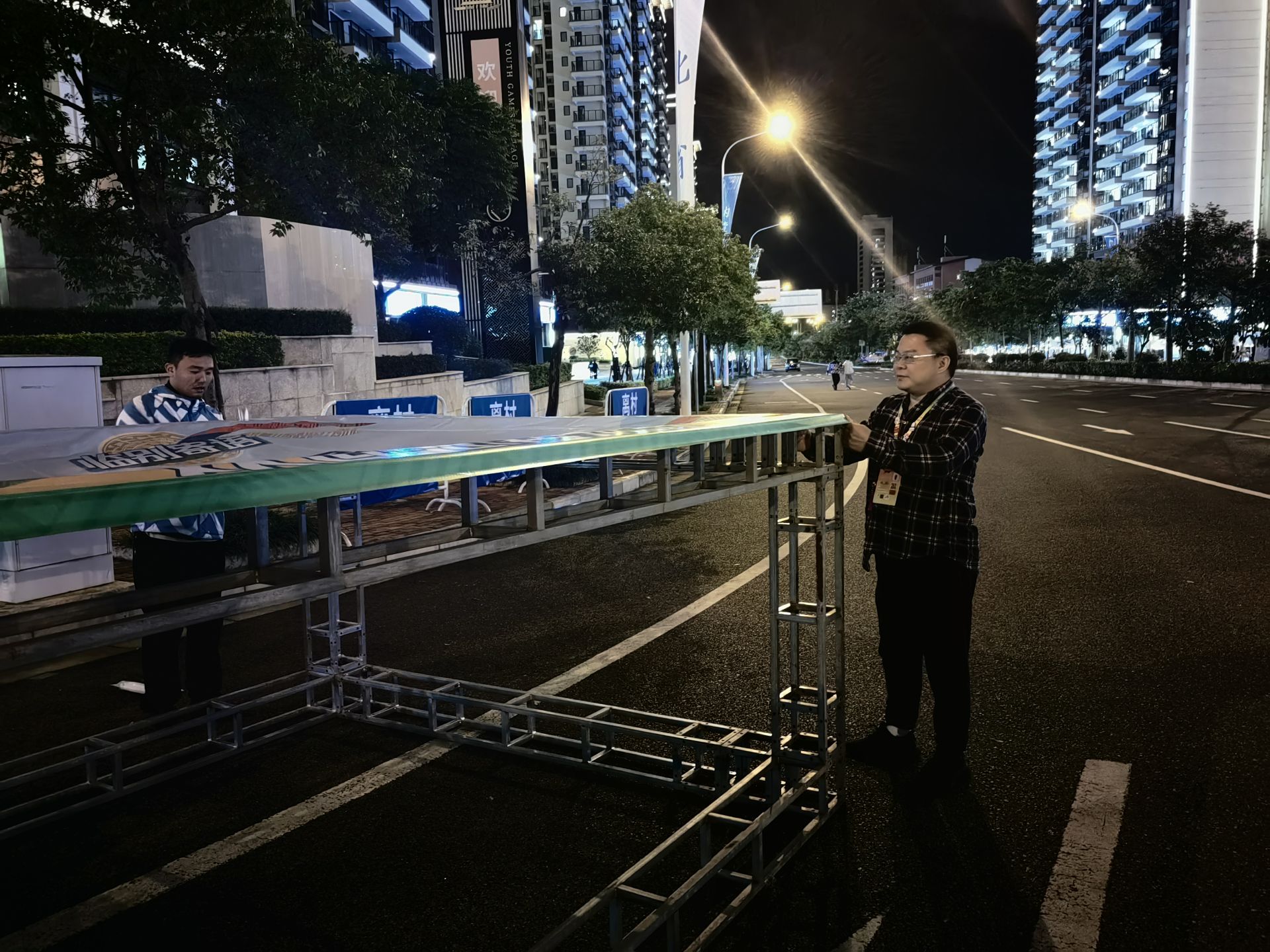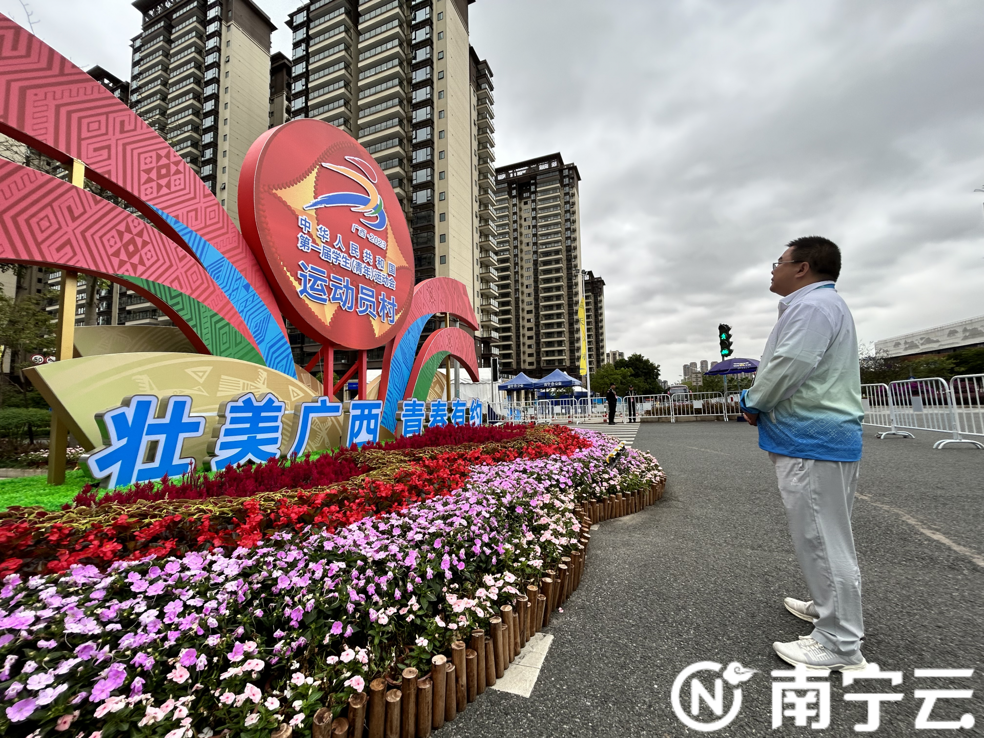 然而,氛圍營(yíng)造整活兒并不如表面上看到的那么歡樂(lè)。對(duì)葉慶來(lái)說(shuō),給運(yùn)動(dòng)員村進(jìn)行氛圍設(shè)計(jì)、布置是個(gè)新的挑戰(zhàn),學(xué)青會(huì)的舉辦時(shí)間、廣西的季節(jié)天氣(臺(tái)風(fēng))等讓他感到棘手。大到五六噸重的設(shè)備,小到一枚防撞貼,他需要考慮到方方面面。每天,葉慶都會(huì)巡村3次,觀察可能發(fā)生的情況。
