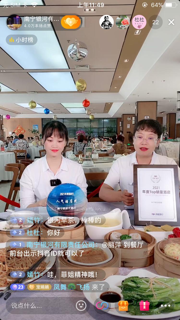 為迅速爭(zhēng)取酒店客源市場(chǎng),她找準(zhǔn)時(shí)機(jī),精心籌備,利用新媒體直播平臺(tái),組建以黨員為主要成員的直播團(tuán)隊(duì),積極打造“紅色直播間”,開展直播帶貨。在關(guān)鍵時(shí)段,她自己上陣主播,擴(kuò)大直播的影響力,通過平臺(tái)向市民展示公司的早茶、月餅、年貨等特色產(chǎn)品,不斷創(chuàng)新經(jīng)營方式,將更多的線上“流量”轉(zhuǎn)化為線下“銷量”,深耕流量經(jīng)濟(jì),實(shí)現(xiàn)直播經(jīng)營常態(tài)化。2022年下半年,銀河公司抖音直播共31場(chǎng)次,累計(jì)觀看達(dá)3.6萬人次,獲得點(diǎn)贊75.6萬次,黨員參與直播共69人次,線上交易金額遠(yuǎn)超預(yù)期目標(biāo),助推了銀河公司健康發(fā)展,擦亮了企業(yè)品牌名片,提升了銀河酒店知名度。