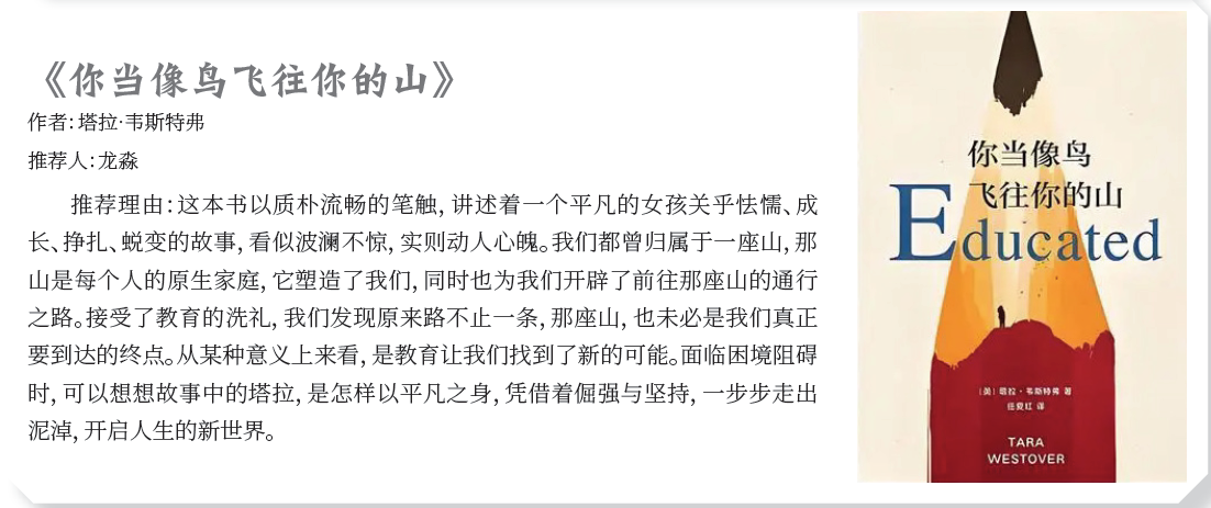 作者:塔拉·韋斯特弗 推薦人:龍淼 推薦理由:這本書以質樸流暢的筆觸,講述著一個平凡的女孩關乎怯懦、成 長、掙扎、蛻變的故事,看似波瀾不驚,實則動人心魄。我們都曾歸屬于一座山,那 山是每個人的原生家庭,它塑造了我們,同時也為我們開辟了前往那座山的通行 之路。接受了教育的洗禮,我們發(fā)現(xiàn)原來路不止一條,那座山,也未必是我們真正 要到達的終點。從某種意義上來看,是教育讓我們找到了新的可能。面臨困境阻礙 時,可以想想故事中的塔拉,是怎樣以平凡之身,憑借著倔強與堅持,一步步走出 泥淖,開啟人生的新世界。