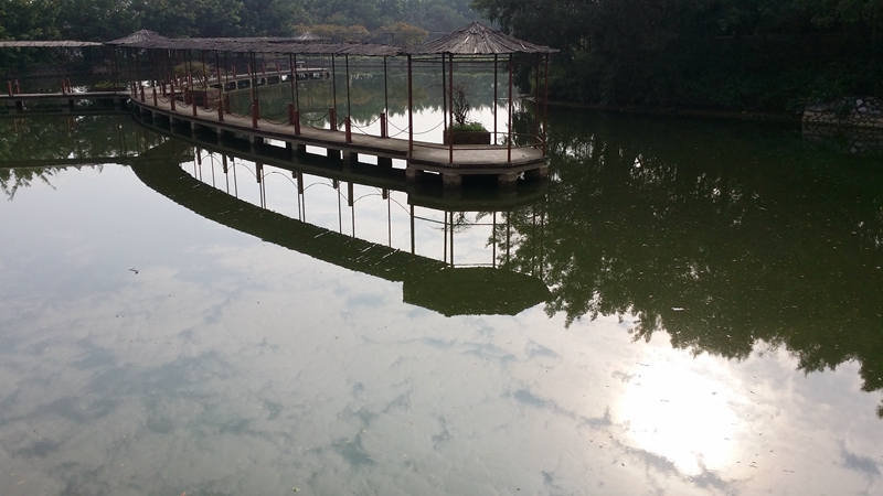 三九晨色霜冷兮,三九晨蘇迷離兮,三九晨曦朦朧兮,人漸醒,夜?jié)u央,一股凝霜凍九天,一盞陽燈亮云綿,一水清池鏡中照,一弧廊亭欲梳妝,一曲靜謐繞亭梁……三九時節(jié)的晨,在這里不見天寒地凍的冷,也沒有萬里冰封的雪,只有特屬于這里的“寒”,帶點瑟瑟入骨的冷,帶點微微入心的涼,甚是帶點爽爽提神的清新,而沉醉于寒夢中的大自然似乎仍未蘇醒,難道是在等著晨暉的鬧鈴或是曙光的報曉,還是在等著有人把它們喚醒呢?其實都不然