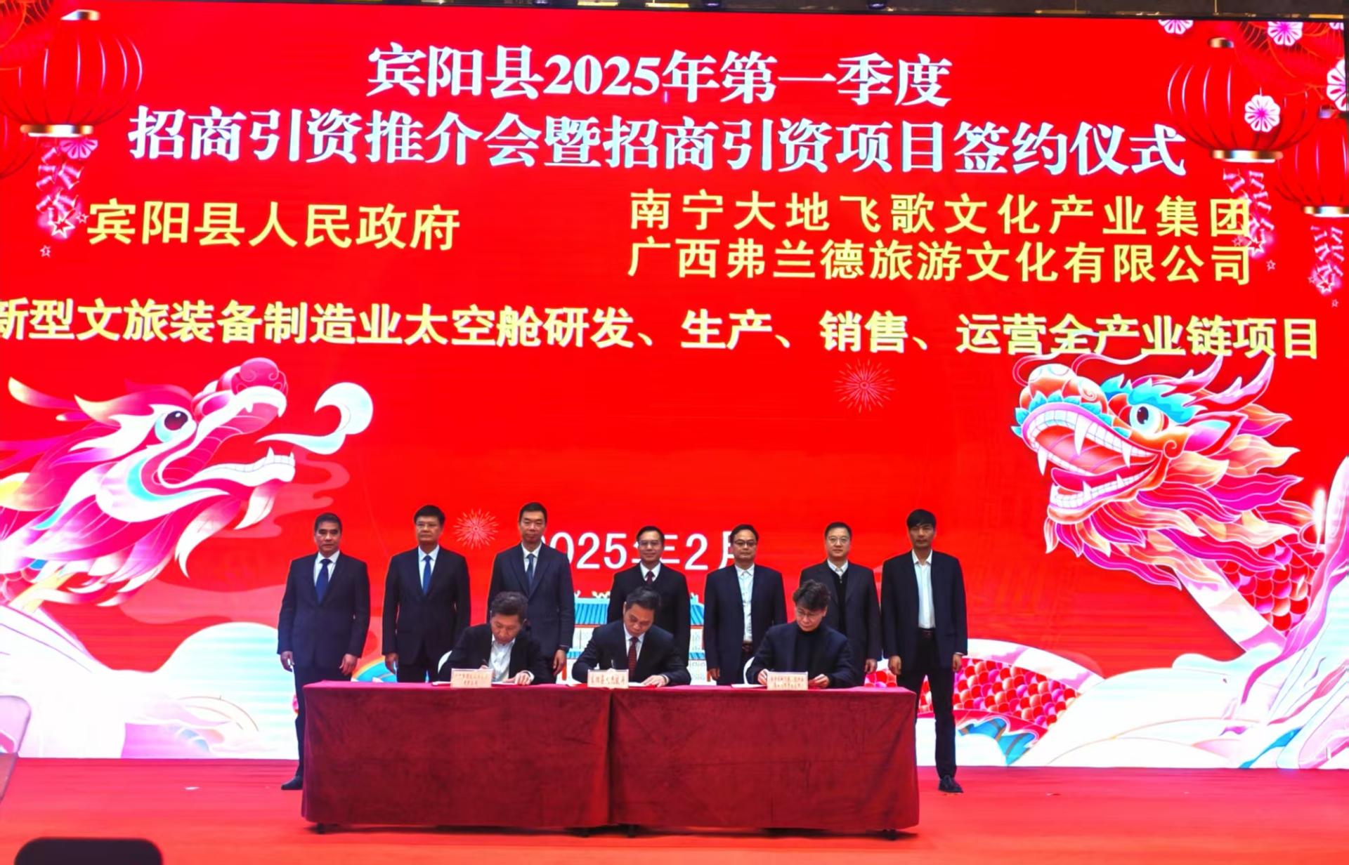 2025年2月8日,南寧大地飛歌集團(tuán)黨委副書記、總經(jīng)理蔡煥雄帶隊參加廣西南寧市賓陽縣2025年第一季度招商引資推介會暨招商引資項目簽約儀式。儀式上,集團(tuán)公司副總經(jīng)理楊凡代表南寧大地飛歌集團(tuán)與賓陽縣政府、廣西弗蘭德旅游文化有限公司簽訂了《新型文旅裝備制造業(yè)太空艙研發(fā)、生產(chǎn)、銷售、運營全產(chǎn)業(yè)鏈項目合作框架協(xié)議書》。儀式后,蔡煥雄接受記者采訪道“今天我們簽約的是新型文旅裝備制造業(yè)——太空艙研發(fā)、生產(chǎn)、銷售、運...