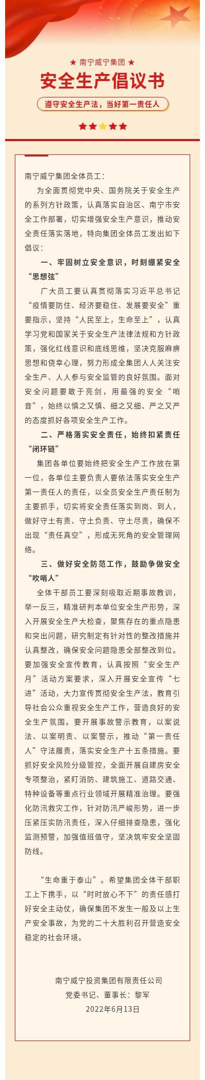 ?宣講現(xiàn)場2022年6月15日,為貫徹落實國務院安委辦、南寧市政府、市國資委和南寧威寧集團關(guān)于做好安全宣傳相關(guān)工作,進一步提高公司員工的安全生產(chǎn)管理能力和水平,加強公司員工的安全意識和技能,威寧文體公司以安全生產(chǎn)月為契機,在廣西體育中心新聞發(fā)布廳開展“人民至上,生命至上”安全集中宣講活動。宣講活動由公司分管安全領(lǐng)導莫文軍副總經(jīng)理主持,邀請了廣西安全工程職業(yè)技術(shù)學院黨委辦公室主任蔣建平進行宣講授課,公司...