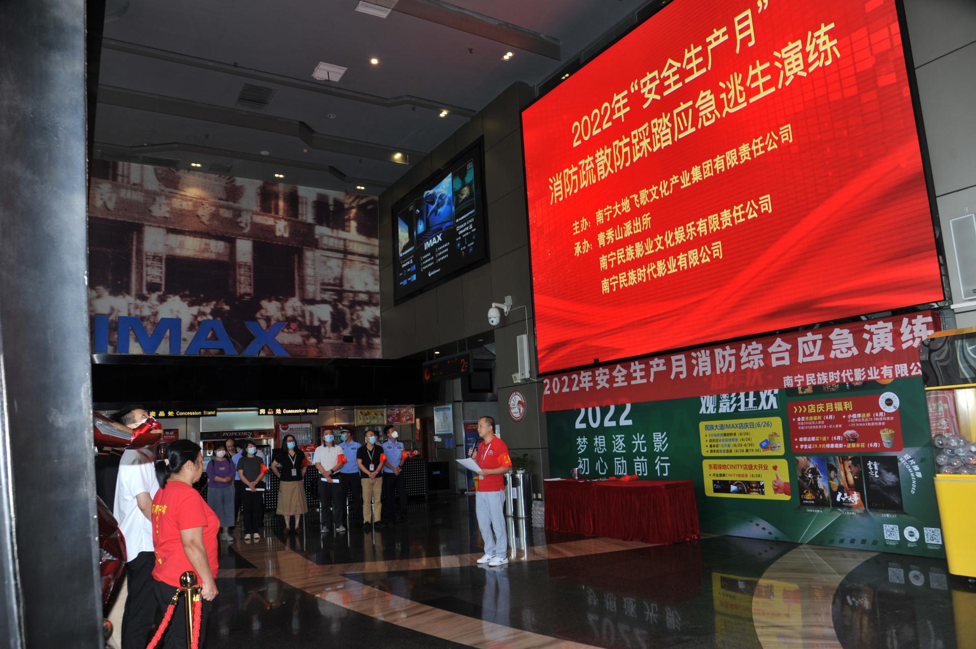 由南寧大地飛歌文化集團有限責任公司主辦(下稱南寧大地飛歌集團公司)、青秀山派出所、南寧民族影業(yè)文化娛樂有限責任公司(下稱民影公司)、南寧民族時代影業(yè)有限公司(下稱時代公司)聯(lián)合承辦的2022年“安全生產(chǎn)月”消防疏散防踩踏應急逃生演練,于2022年6月22日上午在民族影城舉行。南寧大地飛歌集團公司各部門負責人及員工、青秀山派出所部分民警、民影公司、時代公司全體人員、一分公司、影城各租賃企業(yè)(商戶)部...
