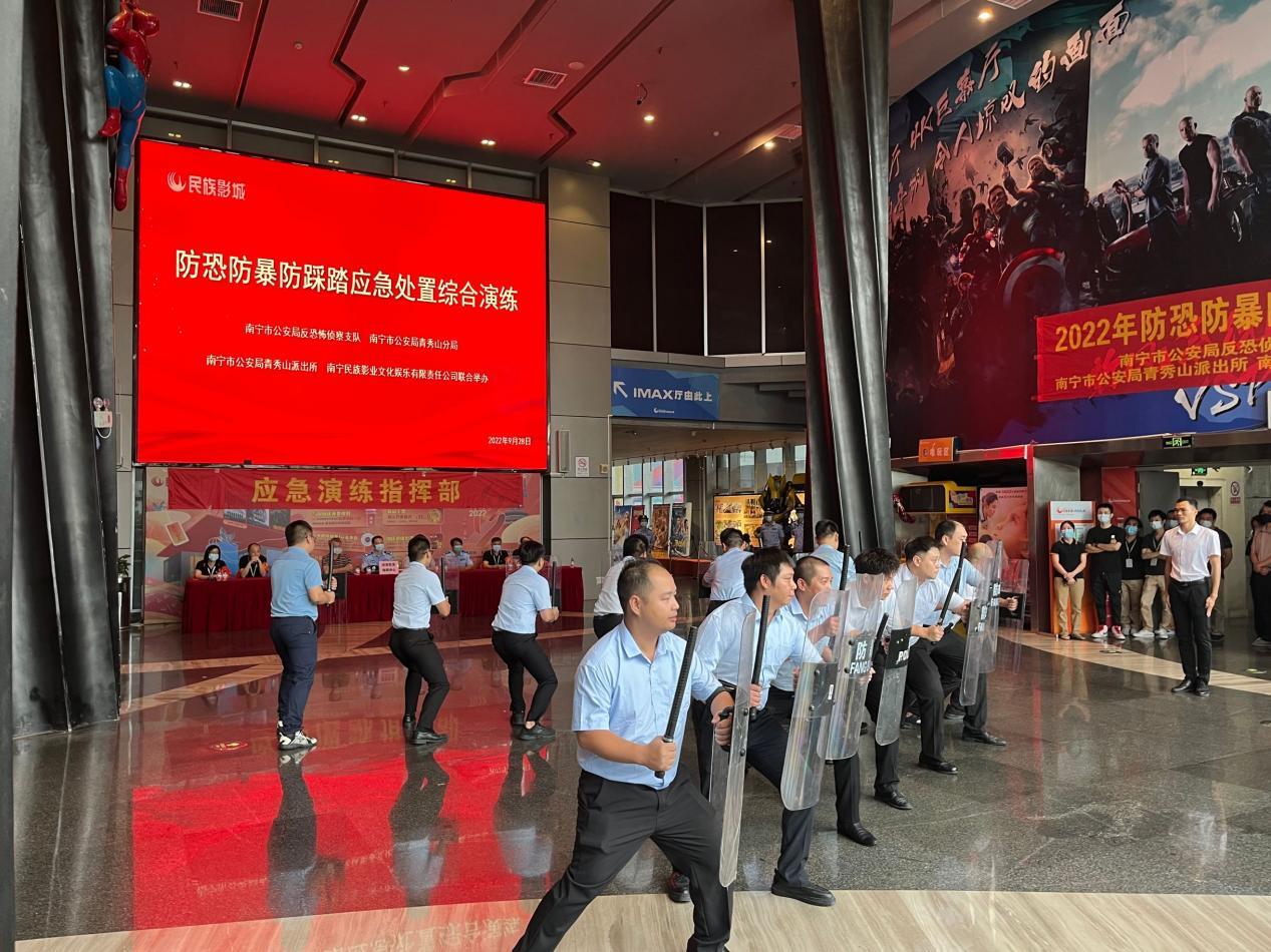 2022年9月28日上午,南寧市公安局反恐怖偵察支隊(duì)、南寧市公安局青秀山分局、南寧市公安局青秀山派出所和南寧民族影業(yè)文化娛樂(lè)有限責(zé)任公司(以下簡(jiǎn)稱“民影公司”)在民族影城聯(lián)合舉辦防恐防暴應(yīng)急演練。應(yīng)急演練現(xiàn)場(chǎng)進(jìn)行了情景模擬:影城與往常一樣有序開(kāi)展經(jīng)營(yíng)活動(dòng),突然,2名“歹徒”沖進(jìn)影城候影大廳,揮舞著匕首、鐵棍。頓時(shí),候影大廳內(nèi)“觀眾”四處逃散、慌亂躲避,場(chǎng)面非?;靵y。在這危急關(guān)頭,...