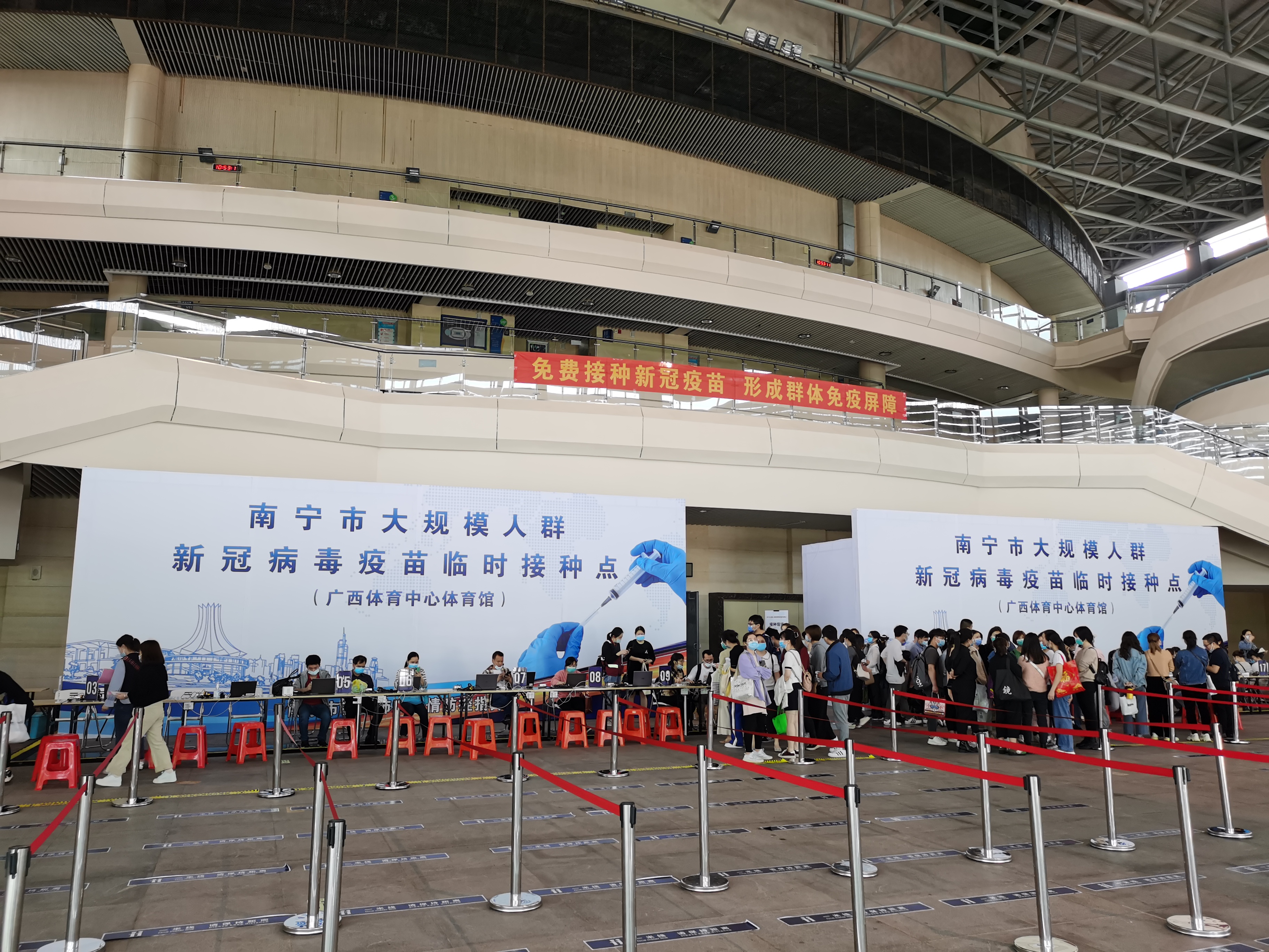 市民有序排隊等待接種疫苗疫苗接種現(xiàn)場規(guī)范整潔威寧文體公司領(lǐng)導(dǎo)檢查現(xiàn)場威寧文體公司工作人員搬運(yùn)物資“別著急,我來幫您填寫信息,您跟我說就可以?!薄罢埓蠹页鍪窘】荡a,按秩序排隊入場?!?021年3月29日,南寧市新冠病毒疫苗大型臨時接種點—廣西體育中心體育館正式對外接待接種疫苗人員,日均接種新冠病毒疫苗能力達(dá)5000劑次以上。在廣西體育中心體育館入口,工作人員耐心向新冠疫苗接種人員講解如何登記信息,遇